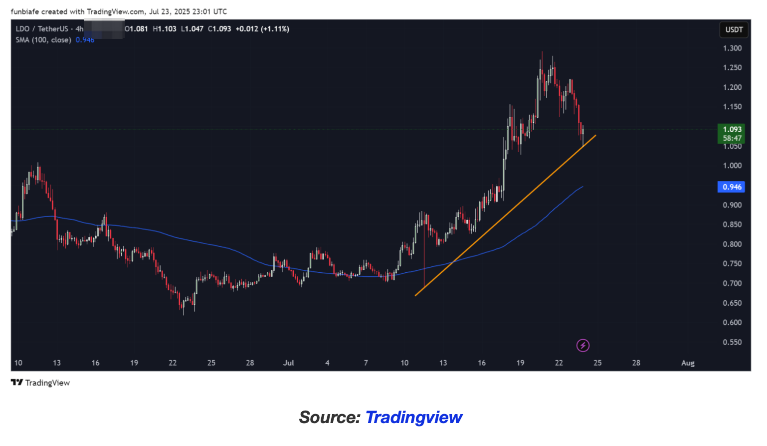 منذ منتصف يوليو، ارتفع سعر Lido DAO (LDO) بشكل مستمر، متجاوزًا المتوسطات المتحركة الرئيسية، واستفاد من الأداء القوي للسوق بشكل عام. ومع ذلك، بعد الاقتراب من نقطة عالية محلية تبلغ حوالي 1.30 دولار، تراجع السعر، وعاد الآن إلى حوالي 1.09 دولار، وهو الآن يختبر مستوى الدعم القصير الأجل الرئيسي على الرسم البياني لمدة 4 ساعات.