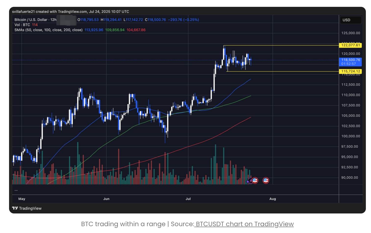 سعر بيتكوين لا يزال يحافظ على التقلب، في انتظار الاختراق تستمر بيتكوين (BTC) في التماسك ضمن نطاق ضيق، حيث يظهر الرسم البياني لمدة 12 ساعة تقلب السعر بين مستوى دعم رئيسي يبلغ $115,724 ومستوى المقاومة $122,077. بعد الارتفاع القوي في بداية هذا الشهر، ضعف الزخم في السوق بشكل ملحوظ، وقد تقلبت BTC في هذا النطاق لأكثر من 10 أيام.