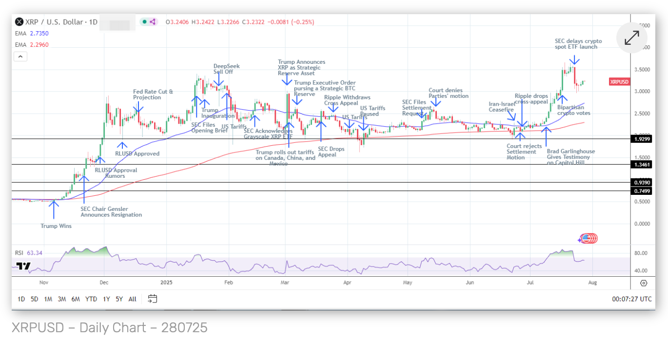 في 27 يوليو ، ارتفع XRP عكس الاتجاه بنسبة 2.34 ٪ ليغلق عند 3.2403 دولار ، متفوقًا على السوق (+1.83 ٪). تركز التحركات قصيرة المدى على عاملين محفزين رئيسيين: