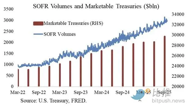 SOFR (معدل التمويل الليلي المضمون) هو معدل الهدف للاحتياطي الفيدرالي، ويمثل معدل شامل لمجموعة من معاملات إعادة الشراء. إذا كانت قيمة صفقة SOFR أعلى من الحد الأقصى لمعدل الأموال الفيدرالية، فهذا يعني ضيق في السيولة النقدية في النظام، مما سيؤدي إلى مشاكل كبيرة. بمجرد حدوث ضيق في السيولة النقدية، سوف يرتفع SOFR بشكل حاد، وسيتوقف النظام المالي المدعوم بالعملات الورقية ذو الرافعة المالية العالية عن العمل. وذلك لأنه إذا لم يتمكن الطرفان في السوق من تداول سيولتهما قرب معدل الأموال الفيدرالية المتوقع، فسوف يتكبدون خسائر كبيرة، وسيتوقفون عن توفير السيولة للنظام. لن يشتري أحد سندات الخزينة الأمريكية لأنهم لن يتمكنوا من الحصول على رافعة مالية رخيصة، مما يؤدي إلى عدم قدرة الحكومة الأمريكية على تمويل نفسها بتكلفة معقولة.