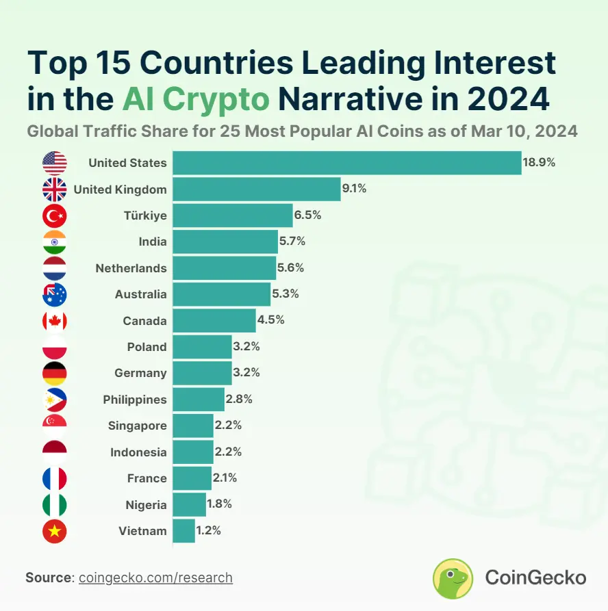 أبدت الولايات المتحدة أكبر قدر من الاهتمام بالقصة الرمزية المتعلقة بالذكاء الاصطناعي في عام 2024، وهو ما يمثل ما يقرب من 19٪ من الاهتمام العالمي. وفقًا لتقرير CoinGecko “15 دولة الأكثر اهتمامًا بالعملات المشفرة المدعومة بالذكاء الاصطناعي في عام 2024”، تحتل المملكة المتحدة المرتبة الثانية بحصة 9٪ من الاهتمام، تليها تركيا بنسبة 6.5٪. يسلط التقرير الضوء أيضًا على تلك البلدان التي ستقود جنون الميمكوين في عام 2023.