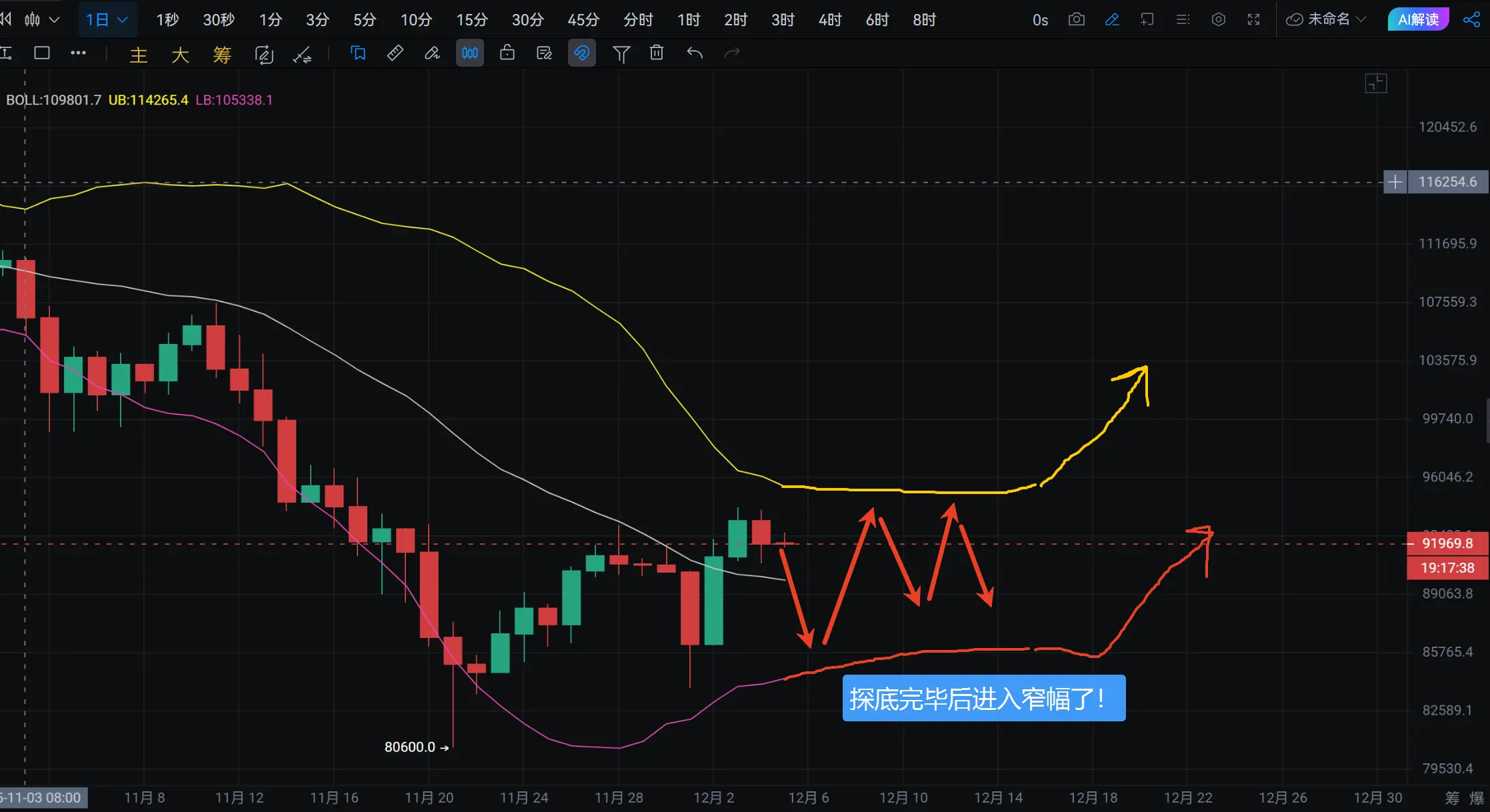 En resumen, la tarea de explorar el techo esta semana está llegando a su fin. Tras completar la formación, será necesario apoyarse en los indicadores para iniciar el proceso de retroceso la próxima semana. La zona de consolidación tras el retroceso será el tiempo para que los grandes acumulen posiciones. Así que no hay que temer esta caída; cuando vuelva a subir, la BOLL en diario entrará en una fase de rango estrecho, lo que dará paso a un nuevo ciclo de tendencia, previsto para principios de enero.
