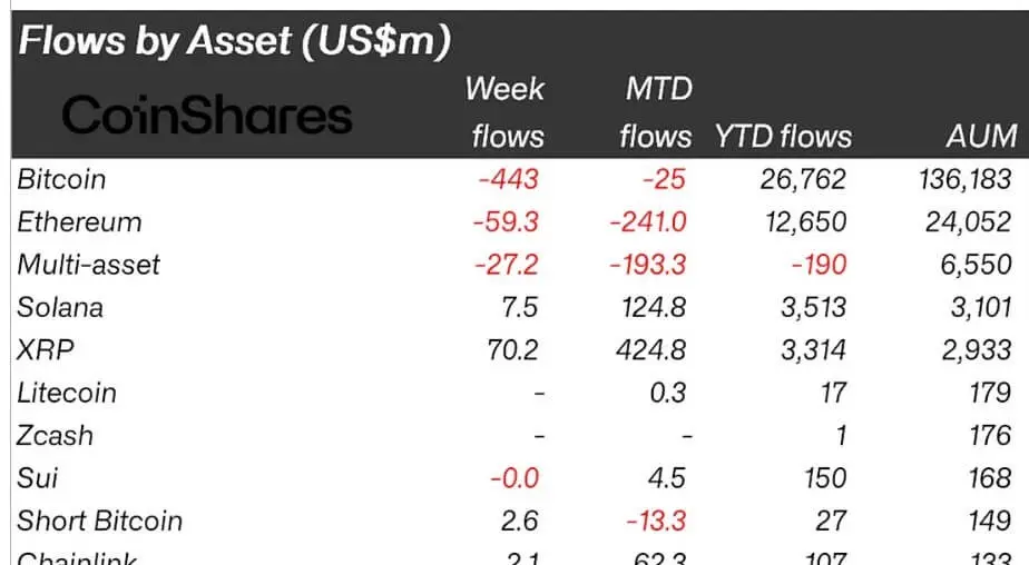 Selon les données de CoinShares, les produits d’investissement XRP ont attiré environ 70,2 millions de dollars en nouveaux fonds nets lors de la dernière semaine de trading de décembre. Cela a porté son flux mensuel à plus de $424 millions, en faisant le produit d’investissement crypto le plus performant du mois.