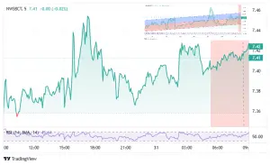 2. Indice NWSBCT pour les Blue Chips : La référence tradable en temps réel, NWSBCT (reproduction investissable du marché large utilisant un sous-ensemble de blue chips), communément appelé « Blue Chips ». Le graphique quotidien montre une dérive progressive autour de la ligne médiane du régression, sans que ni acheteurs ni vendeurs n’exercent un contrôle décisif. Les avancées récentes ont stagné sans momentum, renforçant l’idée que les mouvements actuels font partie d’une rotation intra-plage plutôt que d’une phase précoce de rupture. 📍À 9:00 CET, il se négocie autour de 7,42.
