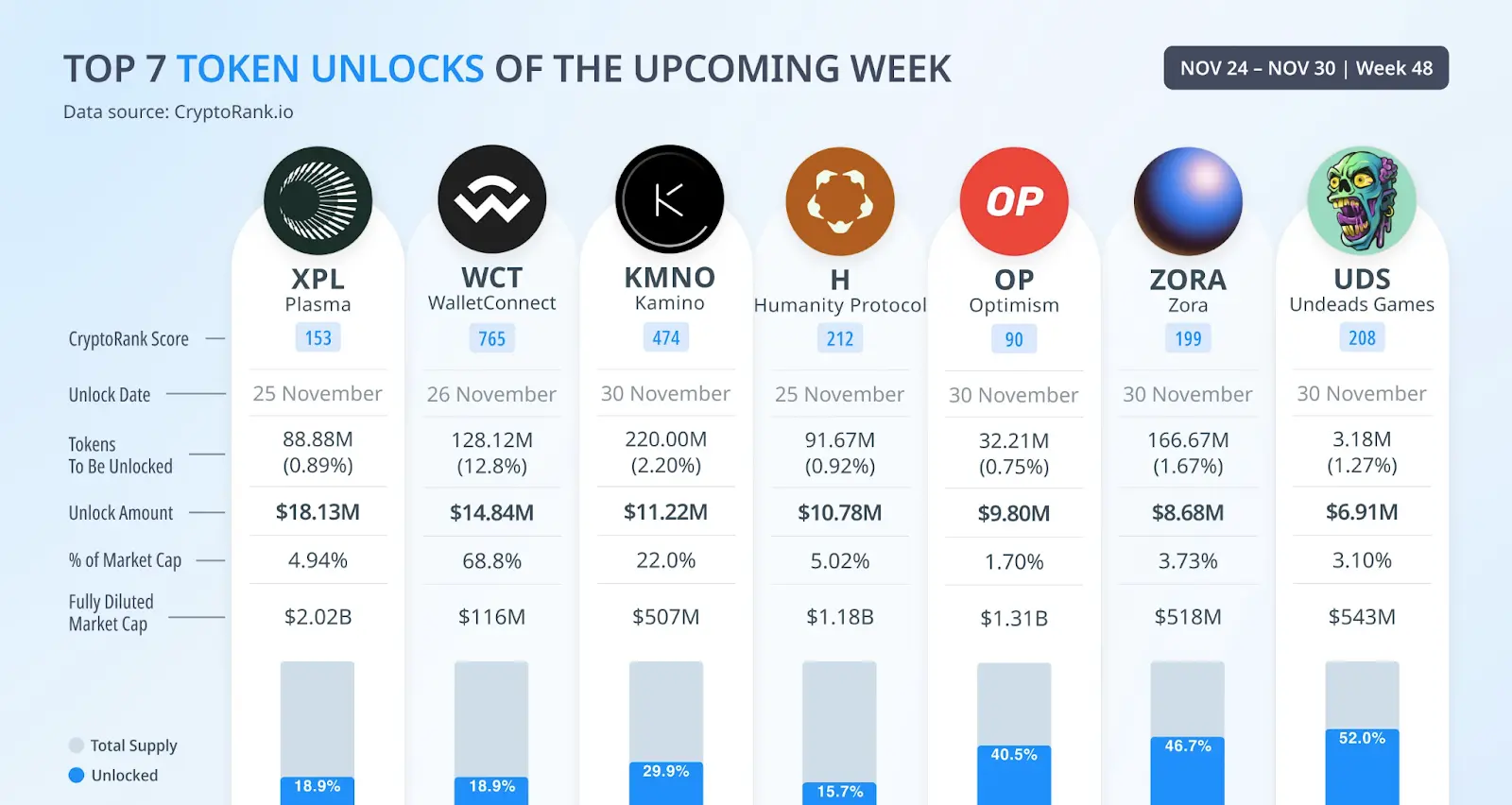 Aktivitas dimulai pada 25 November, ketika Plasma (XPL) akan merilis 88,8 juta token, senilai $18,13 juta, yang merupakan 0,89% dari total suplai. Pada hari yang sama, Humanity Protocol (HUM) dijadwalkan mendistribusikan 91,67 juta token, senilai $10,78 juta, yang setara dengan 0,92% dari total suplai.