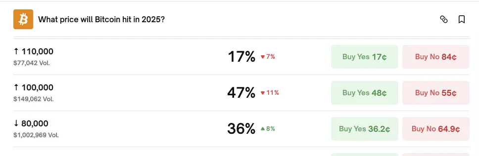 Peluang Bitcoin mencapai $100,000 turun 11% sementara peluang untuk breakout $110,000 juga merosot 7% menjadi 45% pada saat berita ini ditulis. Sementara itu, peluang harga Bitcoin ditutup di bawah $80,000 pada tahun 2025 meningkat 8% menjadi 36%.