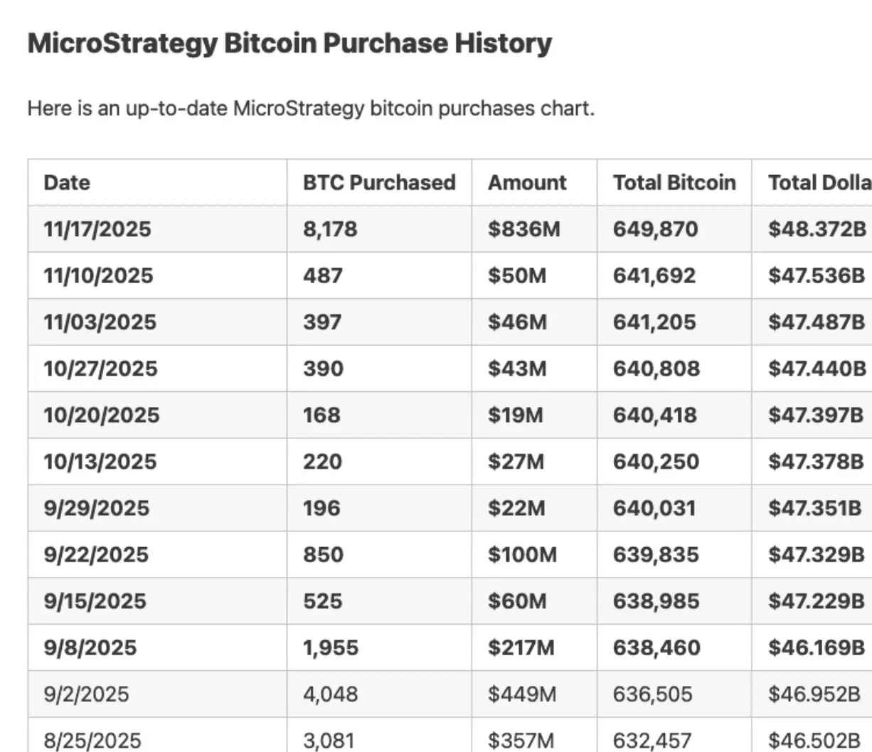 Lebih jauh menegaskan sikap hati-hati di antara para paus Bitcoin, seorang pemegang korporat besar tidak melakukan pembelian minggu lalu, mengakhiri periode 14 minggu yang dimulai pada bulan Agustus. Menurut data yang tersedia, perusahaan tersebut mengonfirmasi pembelian terakhirnya pada 17 November, ketika mereka membeli 8.178 BTC seharga $836 juta, mengangkat total kepemilikan menjadi 649.870 BTC.