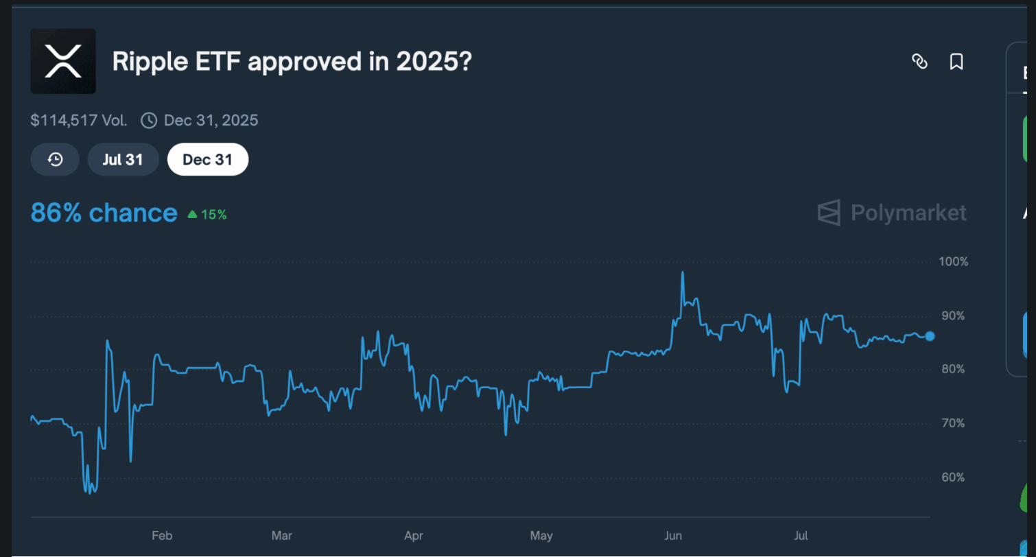 高確率の承認: BalchunasチームはXRP ETFの85%の高い承認確率を維持しています。予測市場Polymarketのデータも同様に、プログラムの遅延があるにもかかわらず、XRP ETFの承認確率は86%に達しています。