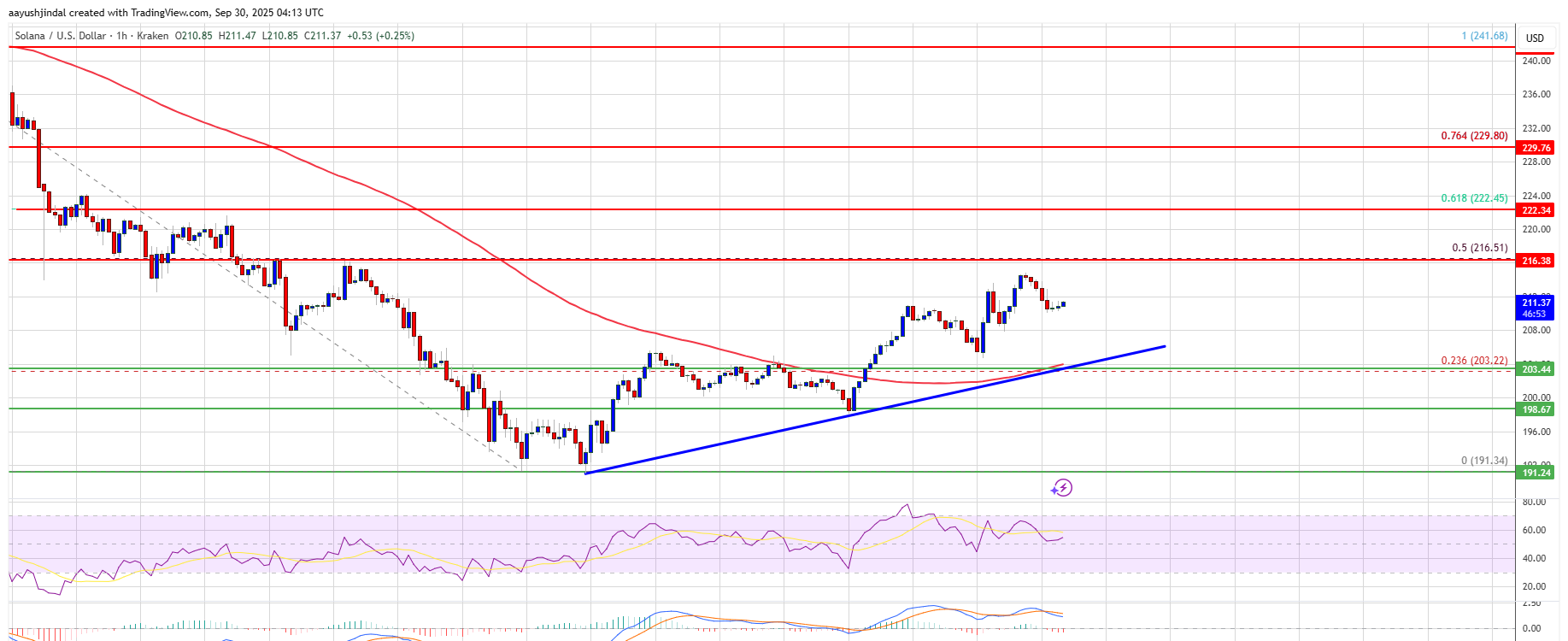 ソラナは$192 ゾーン付近でサポートを見つけました。SOL価格は現在、$200 の上から回復しようとしており、$215付近で障害に直面しています。