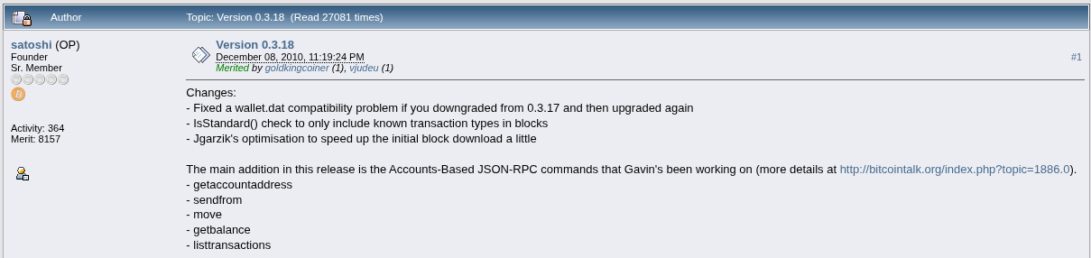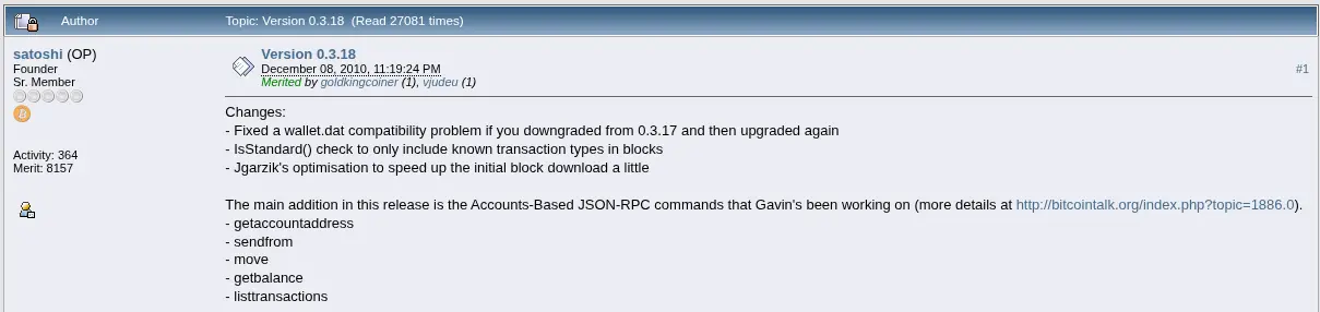 しかし、この議論はOP_RETURN自体よりもはるかに古く、これは2014年3月にビットコインコア0.9.0で導入されました。2010年、ビットコイン(BTC)がわずか1年しか経っていなかったとき、プロトコルの仮名の作成者であるサトシナカモトは、取引データが意図された基準に準拠していることを確認するためのチェックを導入することで同じ議論を引き起こしました。