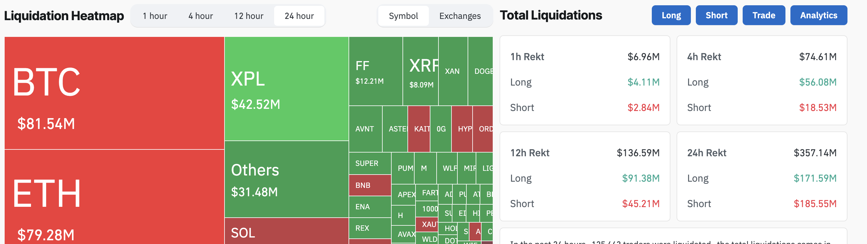 週末のラリーは主要な暗号通貨で清算を引き起こしました。市場データによると、24時間以内に約3億5714万ドルのポジションが清算され、そのうちショートポジションは1億8555万ドルを占めました。ビットコインは8154万ドルの清算で市場をリードし、XRPは809万ドルを占めました。