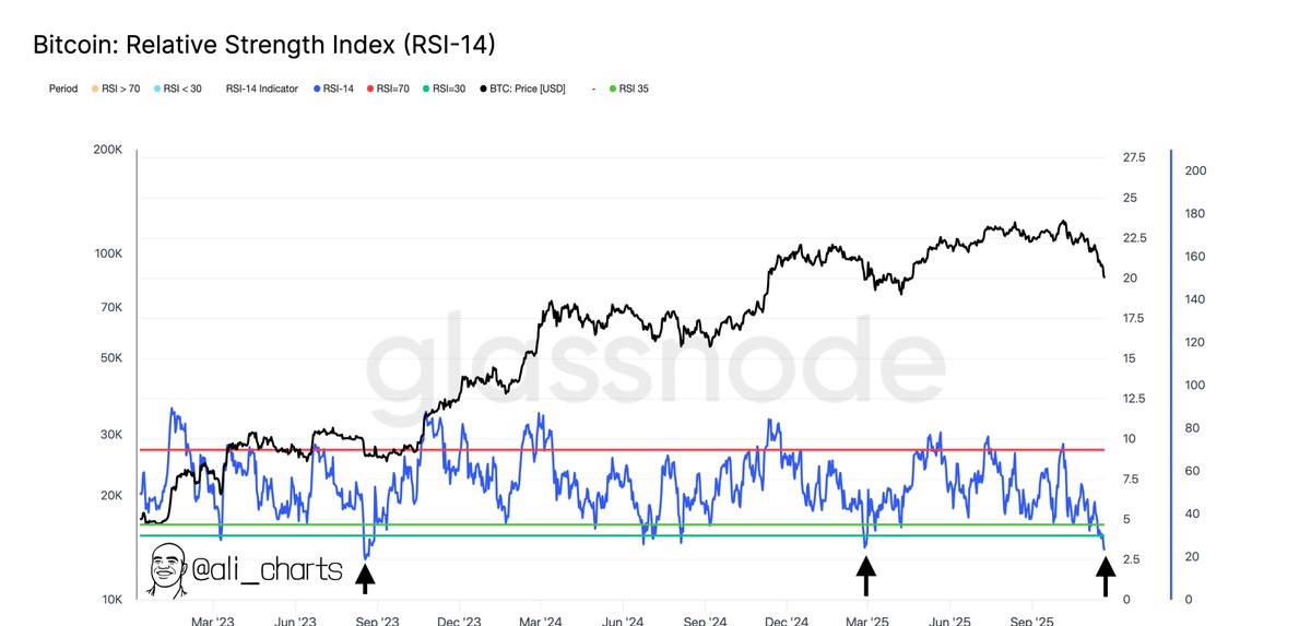オンチェーンアナリストのアリ・マルティネスからの最も明確な信号の一つは、ビットコインが現在、相対力指数(RSI)で極端な売られ過ぎの領域に入ったことを強調していることであり、この状態は歴史的に注目すべき反発の前に見られた。