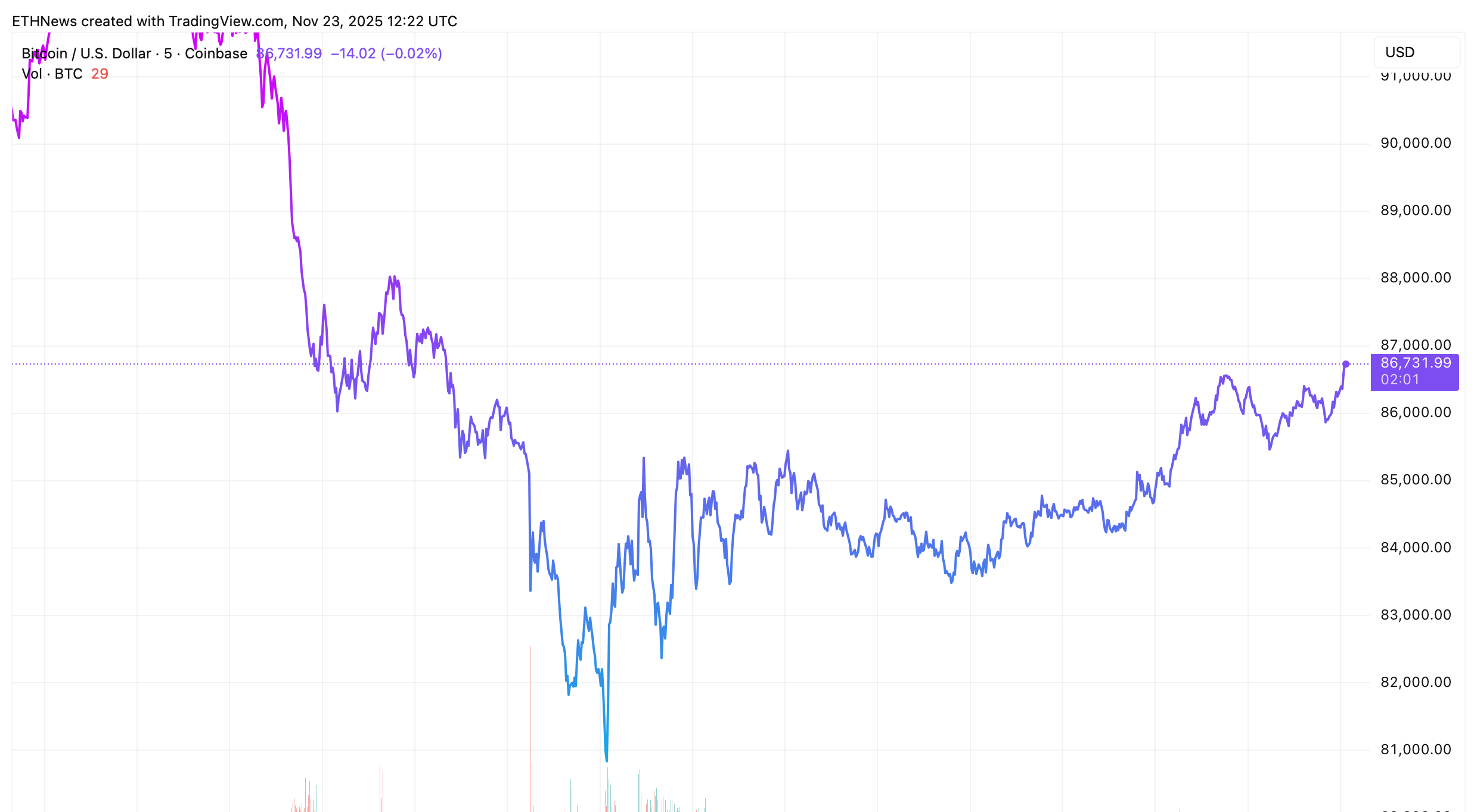 ビットコインの現物チャートは、$86K–$87K ゾーン付近での買い手と売り手の明確な戦いを示しています。このエリアを上回ることができれば、アリが示唆している回復の継続を強化するでしょう。