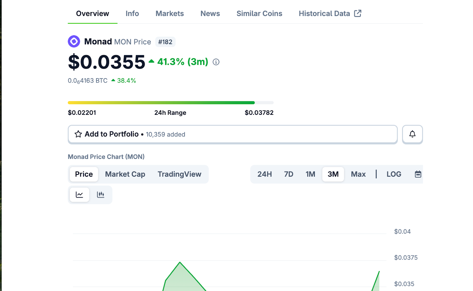 モナドの長らく待たれていたメインネットのローンチが初めての大きなブレイクアウトを引き起こしました。MONトークンは過去24時間で42%上昇し、現在の取引価格は$0.03632、時価総額は3億9239万ドルで、トップ200の暗号トークンに位置しています。この上昇は、メインネットへの興奮、新しい取引所への上場、そして初期供給の厳しさの組み合わせを反映しています。