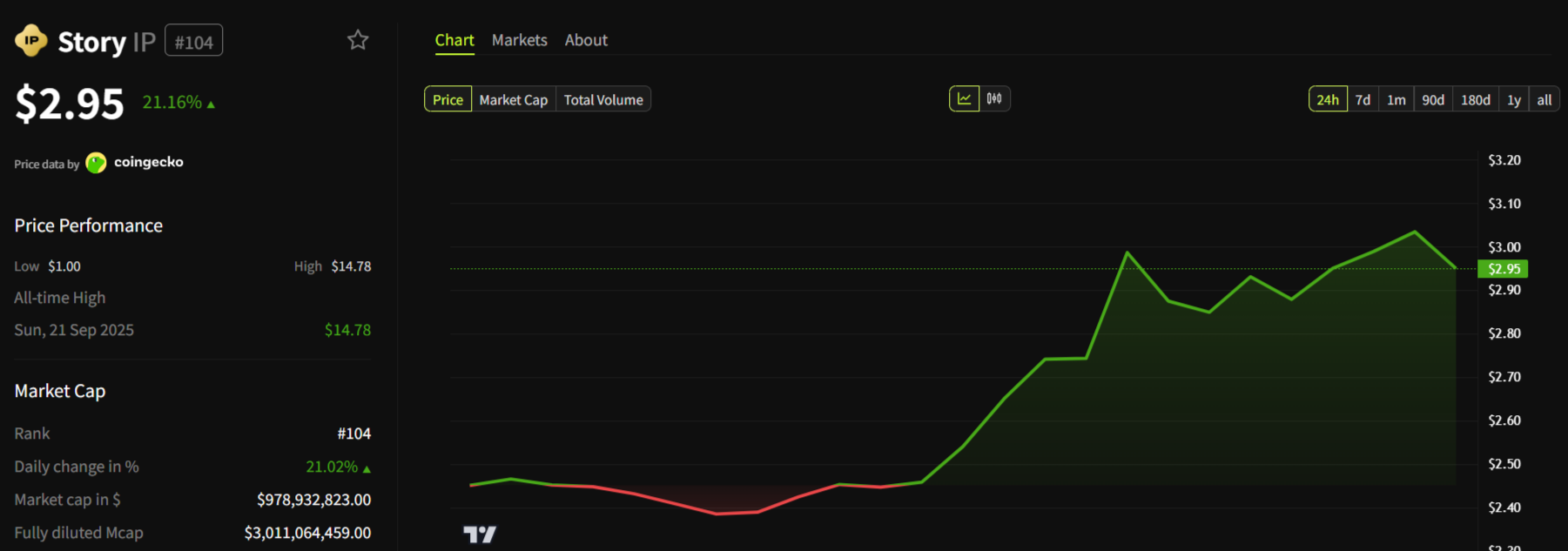 水曜日の午前2時(UTC)の時点で、Story ProtocolのIPトークンは$2.98で取引されており、前日比21.48%の増加を示しています。このトークンは主要な取引所で1億4,563万ドルの取引量を記録しました。市場価値は9億7,542万ドルに達し、世界の暗号通貨の中で104位にランクされています。
