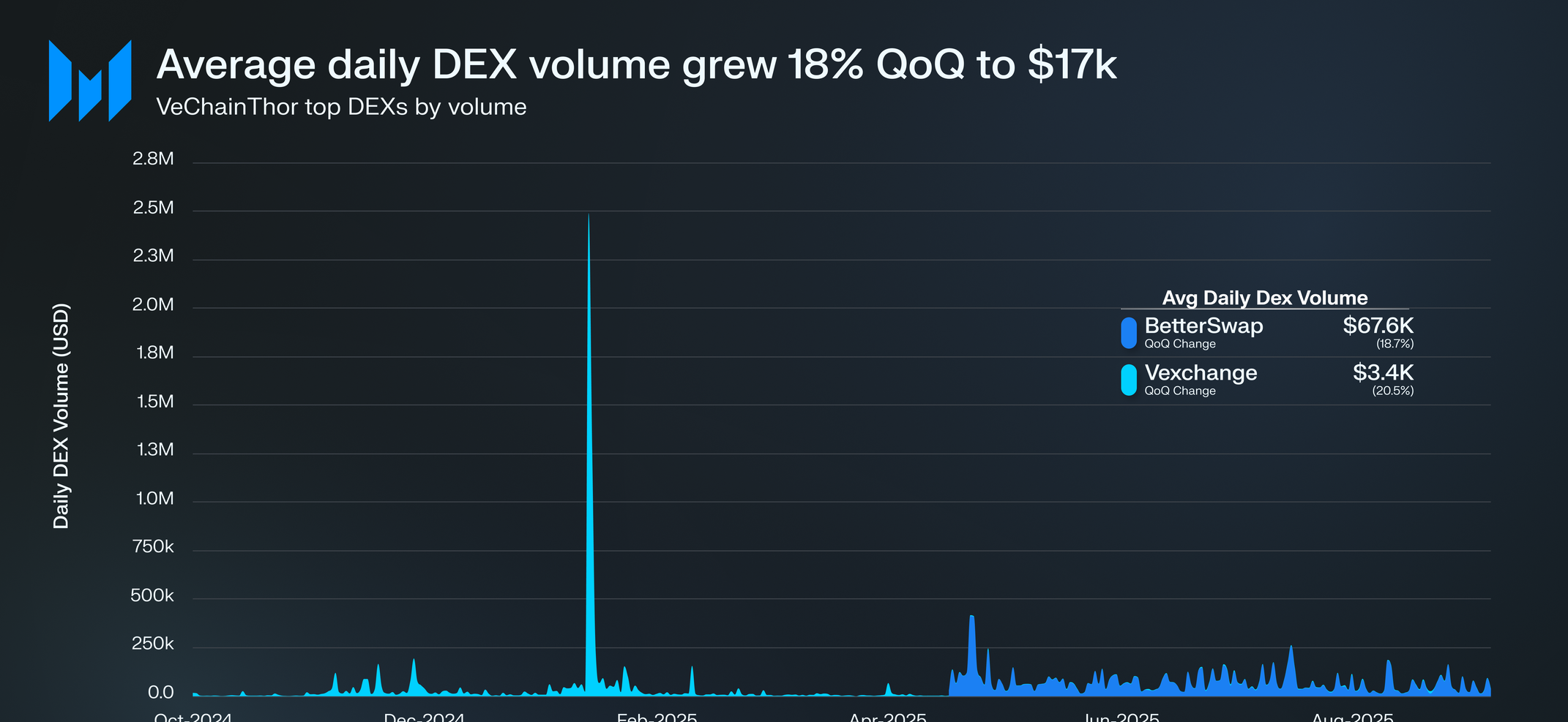ソース: CryptoNewsNetオリジナルタイトル: VeChainは、DeFiのTVLが815%増加し、ユーザー活動が加速する中で、Q3の大規模な拡張を目撃する元のリンク: * **VeChain (VET)は、2025年第3四半期に610万ドルのTVLを記録し、そのうちVeDeleGateが480万ドルを貢献しました。*** **VETはこの期間中に市場キャップが2.2%上昇し、19億ドルとなりましたが、VTHOは市場キャップが15.5%減少しました。**最近のMessariレポートによると、VeChain (VET)は2025年第3四半期(Q3 2025)において、そのエコシステムの各セクターで大きな成長を記録しました。分散型金融(DeFi)セクターは大きなブームを迎え、**815.4%**の急増で総ロック価値(TVL)が610万ドルに達しました。四半期別(QoQ)。データによると、VeDeleGateは4.8百万ドルのTVLで大部分を占めました。これは総額の77%に相当します。VeDeleGateは、固定期間のステーキング開始のおかげでこの偉業を成し遂げました。VeChainは、四半期ごとに62,800のデイリーアクティブアドレスの増加を見ており、**85.2%**の急増を示しています。この期間中、取引条項は四半期ごとに**32.3%**増加し、370,000に達しました。興味深い観察は、この記録がネットワーク活動の二四半期の減少を逆転させたことです。平均デイリー新規アドレスも四半期ごとに**54.4%**増加し、2025年第3四半期には40,900に達しました。Messariのデータは、平均的な分散型取引所(DEX)の取引量が第3四半期に**18.4%**増加し、$71,000に達したことを示唆しています。これは$60,000からの増加です。BetterSwapだけで、約$67,600のデイリー取引量を処理しました。この報告によれば、これは全体のDEX活動の95.3%を占めています。### VeChain (VET)とVTHOの時価総額レポートをさらに確認したところ、VETの時価総額が広範な市場の苦戦にもかかわらず、前四半期比で**2.2%**の上昇を見せ、19億ドルに達していることがわかりました。VETの価格は前四半期に記録された0.021ドルから0.022ドルで四半期を終了しました。時価総額の観点では、市場で57番目に大きな暗号通貨となりました。執筆時点では、VETは0.013ドルで取引されており、60番目に大きな暗号通貨として三つのランクを落としていました。VETとは異なり、VeChainThorのガストークンであるVTHOは、四半期の終わりに市場価値が148.8百万ドルとなり、前の四半期から**15.5%**の減少を示しました。価格も**18.5%**減少し、0.0016ドルとなりました。Santimentによれば、市場価値と資産の価格のQoQ変化の不一致は、この期間中の総供給の3.7%の増加に起因しています。### 技術的アップグレードとパートナーシップこれらのオンチェーンの成長に加えて、2025年第3四半期は、ルネサンスアップグレードの進展を含む複数のアップグレードと開発が見られました。この期間中には、ステーキングの統合、メインネットレベルのEVMの強化、ハヤブサの下での次世代コンセンサスへの移行に向けた準備が行われました。この四半期では、ギャラクティカメインネットの立ち上げや、ダイナミックフィーメカニズム、上海EVMアップグレード、型付きトランザクションなどの導入も目撃されました。VeChainは7月1日にRenaissance Roadmapの一環としてStarGateステーキングプラットフォームを立ち上げました。これらに加えて、VeChainはRevolut Learn & Earn Programを含む複数の高プロフィールなパートナーシップを発表しました。また、BitGoと提携して、VETおよびVTHOのための機関向けのカストディサービスを開始しました。