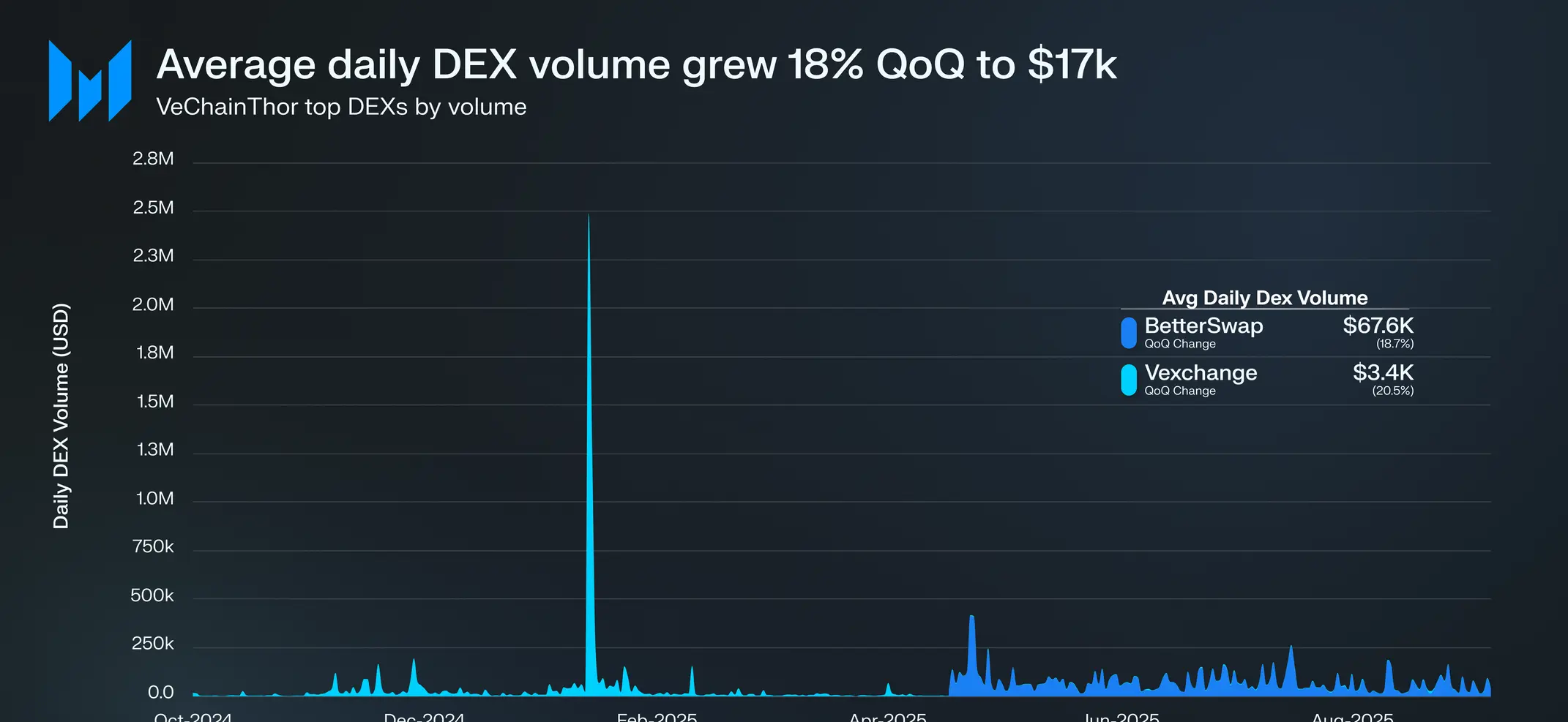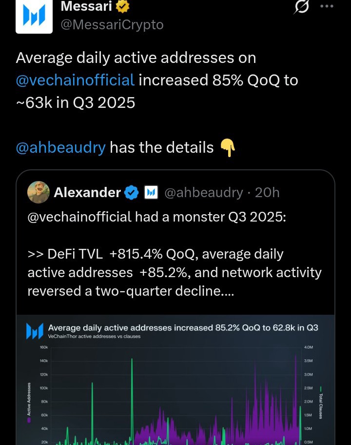 最近のMessariレポートによると、VeChain (VET)は2025年第3四半期(Q3 2025)において、そのエコシステムの各セクターで大きな成長を記録しました。分散型金融(DeFi)セクターは大きなブームを迎え、**815.4%**の急増で総ロック価値(TVL)が610万ドルに達しました。四半期別(QoQ)。