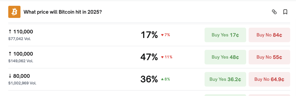 ビットコインが$100,000に達する可能性は11%減少し、$110,000のブレイクアウトの可能性も7%下がり、発表時点で45%になりました。一方、2025年のビットコイン価格が$80,000の下で終わる可能性は8%上昇し、36%に達しました。