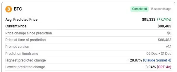 しかし、より詳細に見ると、3つの大規模言語モデルが大きく異なるビットコイン価格予測を示していることが明らかになります。Claude Sonnet 4は29.97%の急騰を予測しており、これによりBTCは12月31日までに$115,000に戻ることになります。