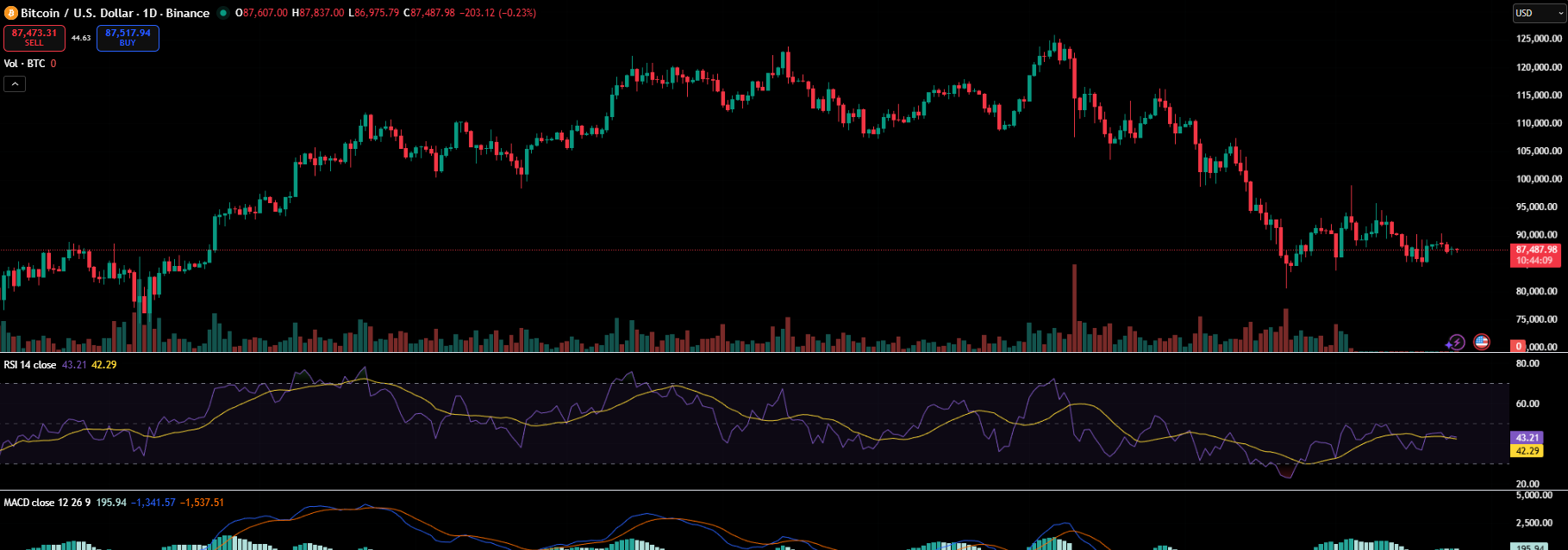 RSIは低40台に位置し、弱い勢いを示す一方で、売られ過ぎの状態ではありません。これは、売り手が疲弊していない一方で、買い手が積極的に参入するのをためらっていることを示しています。一方、MACDはマイナス圏にとどまり、安定化の兆しは控えめであり、強気の勢いが再び表面化していないことを示しています。