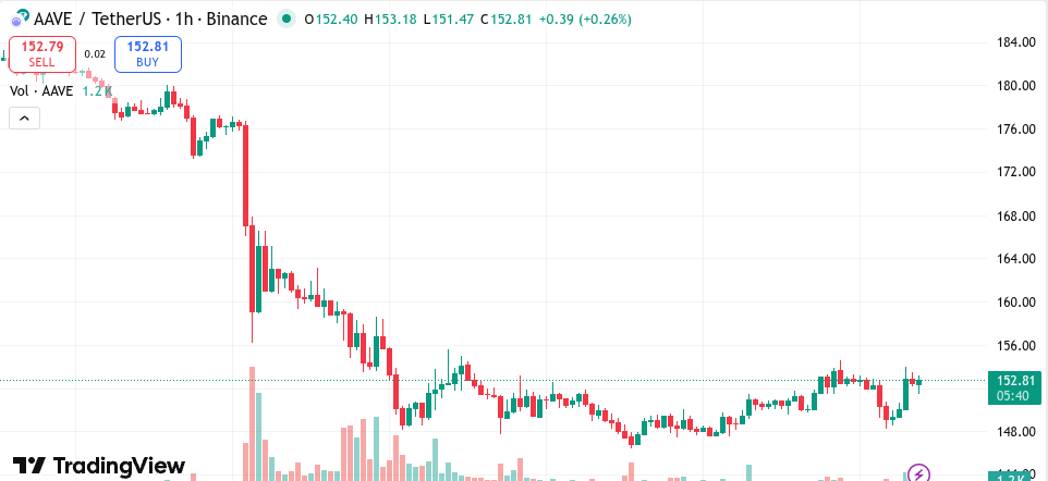 AAVEは現在約152.72ドルで取引されており、過去24時間で1.77%上昇している。価格は一時大きく下落し、依然として売り圧力に直面している。ただし、重要なサポートレベル付近で安定している。