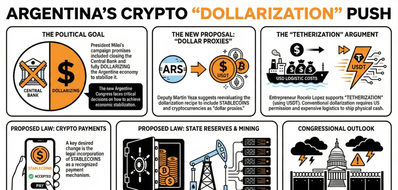 ソース:CryptoNewsNetオリジナルタイトル:アルゼンチンのアナリストは経済の「テザリゼーション」が2026年の議会ロードマップに入る可能性があると考えるオリジナルリンク:https://cryptonews.net/news/finance/32189694/新しいアルゼンチン議会は、今年いくつかの重要な暗号通貨およびステーブルコインに関連する問題に対処しなければなりません。副議長のマーティン・イエザによると、政府は今年、経済の安定化のためにドル化のレシピを再評価し、ステーブルコインや暗号通貨をドルの代理として取り入れる予定です。彼はIgroupとのインタビューで次のように述べました:> 一連の改革が実施されれば、私たちは大きな抵抗に直面し、そのようなセッションは議会で好意的に受け入れられないでしょう。しかし、彼が望む変更の一つは、ステーブルコインを支払い手段として取り入れることです。また、中央銀行が暗号通貨を保有し、YPFなどの国営企業を通じてマイニングすることを許可することも、政府がこれらの可能性をすぐに活用しなくても良いと考えれば、プラスになると考えています。大統領のミレイ氏の主要な選挙公約の一つは、中央銀行を閉鎖し、経済をドル化してインフレ率を下げることでした。地元の暗号通貨起業家ロセロ・ロペスは、アルゼンチン経済の「テザリゼーション」を支持し、市場資本化で最大のステーブルコインの発行者を指しています。このアプローチは、米国政府を巻き込まずに、従来のドル化プロセスに比べてメリットを提供するとロペスは強調しました。操作は追跡可能で、低コストの取引が可能です。最近の報告によると、アルゼンチンの銀行は顧客に暗号通貨サービスを提供する準備が整っており、中央銀行は民間銀行に暗号通貨市場を開放するための特別措置を策定中です。## 重要ポイント- 新しいアルゼンチン議会は、2026年に経済の安定化を支援するために、ステーブルコインと暗号通貨をドルの代理として再評価します。- 副議長のマーティン・イエザは、ステーブルコインを支払い手段として取り入れることと、中央銀行が暗号通貨を保有し、国営企業を通じてマイニングすることを支持しています。- 地元のアナリストは、「テザリゼーション」を従来のドル化の柔軟な代替手段として推奨し、追跡性や低コストの取引といったメリットを提供し、米国の承認を必要としません。- アルゼンチンの銀行は暗号通貨サービスの提供準備を進めており、中央銀行は民間銀行に暗号通貨市場を開放するための措置を検討しています。