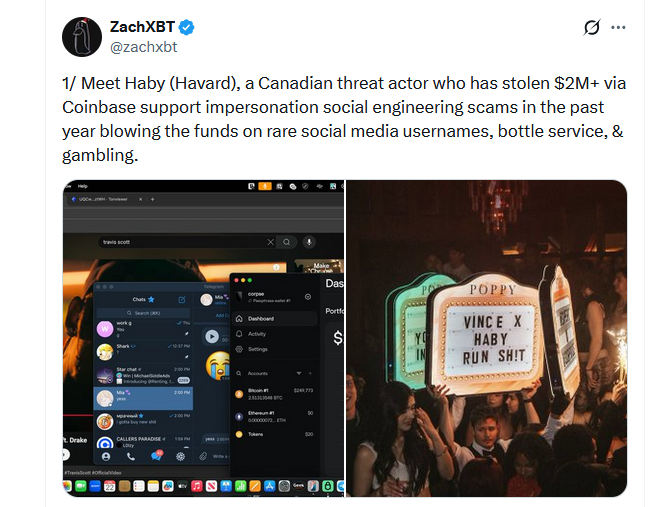 ZachXBTは、「カナダの脅威アクター」が「サポートのなりすましやソーシャルエンジニアリング詐欺を通じて過去1年で$2M+を盗み、希少なソーシャルメディアのユーザーネーム、ボトルサービス、ギャンブルに資金を使った」と述べました。