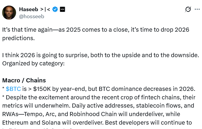 Source: CryptoNewsNetOriginal Title: Tech giant to launch crypto wallet, fintech L1s will bomb: Dragonfly exec.Original Link: 大手テック企業が2026年に暗号ウォレットを統合し、フォーチュン100企業のさらに多くが独自のブロックチェーンを開始すると、暗号VC企業Dragonflyのマネージングパートナー、ハシーブ・クレシ氏は予測している。彼はまた、EthereumやSolanaのようなパブリックチェーンと競合するL1を立ち上げるフィンテック企業は十分なユーザーを引き付けることに失敗すると予測している。最近の分析で、クレシはフォーチュン100の採用の多くは銀行やフィンテックセクターから来る可能性が高く、多くはアバランチのブロックチェーンやOPスタック、Orbit、ZKスタックなどの既存の暗号ツールキットを活用すると述べた。これにより、これらのネットワークはよりプライベートで許可制にしながら、パブリックブロックチェーンと接続し続けることができる。金融サービス業界のフォーチュン100企業のいくつかはすでにプライベートブロックチェーンを構築しており、JPMorgan、Bank of America、Goldman Sachs、IBMなどが含まれるが、これらの多くはまだテスト段階にあるか、限定的に使用されている。今月初め、暗号投資会社Galaxy Digitalは、2026年までに少なくとも1つのフォーチュン500の銀行、クラウドプロバイダー、またはeコマースプラットフォームが、$1 十億ドルを超える実経済活動を決済するレイヤー1ブロックチェーンを立ち上げ、分散型金融アクセスのための橋を築くと予測した。クレシはまた、オンライン生活を支配する大手テック企業の一つ—おそらくGoogle、Meta、Apple—が2026年に暗号ウォレットを発売または買収するだろうと考えている。この動きは、何十億ものユーザーを暗号に取り込む可能性がある。## パブリックフィンテックチェーンはEthereumの支配に挑戦しないしかし、クレシはフィンテック企業が構築した新しいL1ブロックチェーンには楽観的ではなく、それらは十分なユーザーを引き付けたり、EthereumやSolanaのような暗号ネイティブネットワークに対抗できるほどのネットワーク活動を獲得したりしないと主張している。> 最近のフィンテックチェーンの盛り上がりにもかかわらず、その指標は期待外れになるだろう。日次アクティブアドレス数、ステーブルコインの流れ、RWAは期待以下となり、EthereumとSolanaは期待以上となる。最良の開発者たちは中立的なインフラチェーン上で引き続き構築し続けるだろう。## ビットコインは$150K を上回るが、市場シェアは失う価格予測に関して、ドラゴンフライの幹部はビットコインが2026年末までに150,000ドルを超えて取引されると予想しているが、ビットコインの支配率は低下すると予測している。Galaxy Digitalは堅実な予測を避け、2026年は「あまりにも混沌としている」ため予測さえ困難だと述べており、来年末までに価格は50,000ドルから250,000ドルの範囲になる可能性がある。一方、クレシは$312 十億ドル規模のステーブルコイン市場が2026年に60%成長し、現在の市場リーダーであるテザー(USDT)の支配率が60%から55%に低下すると予測している。## クレシ、予測市場には楽観的だが、暗号におけるAIには懐疑的予測市場は来年も引き続きブームになるだろうが、クレシはAIはセキュリティを超えた用途には暗号には見つからないだろうと述べた。> AIエージェントは2026年には「互いに支払いをしたり」意味のある金額を使ったりしないだろうし、また、ソーシャルプラットフォーム上のスパムボットの蔓延を抑制する効果的な解決策も出てこないと予測している。
