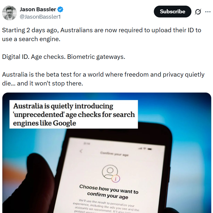 The Free Thought Projectポッドキャストの共同創設者ジェイソン・バスラーは、「2日前から、オーストラリア人は検索エンジンを使うためにIDをアップロードする必要がある」と述べ、同国は「自由とプライバシーが静かに死ぬ世界のベータテストだ… そしてそこに止まらないだろう」と推測しています。