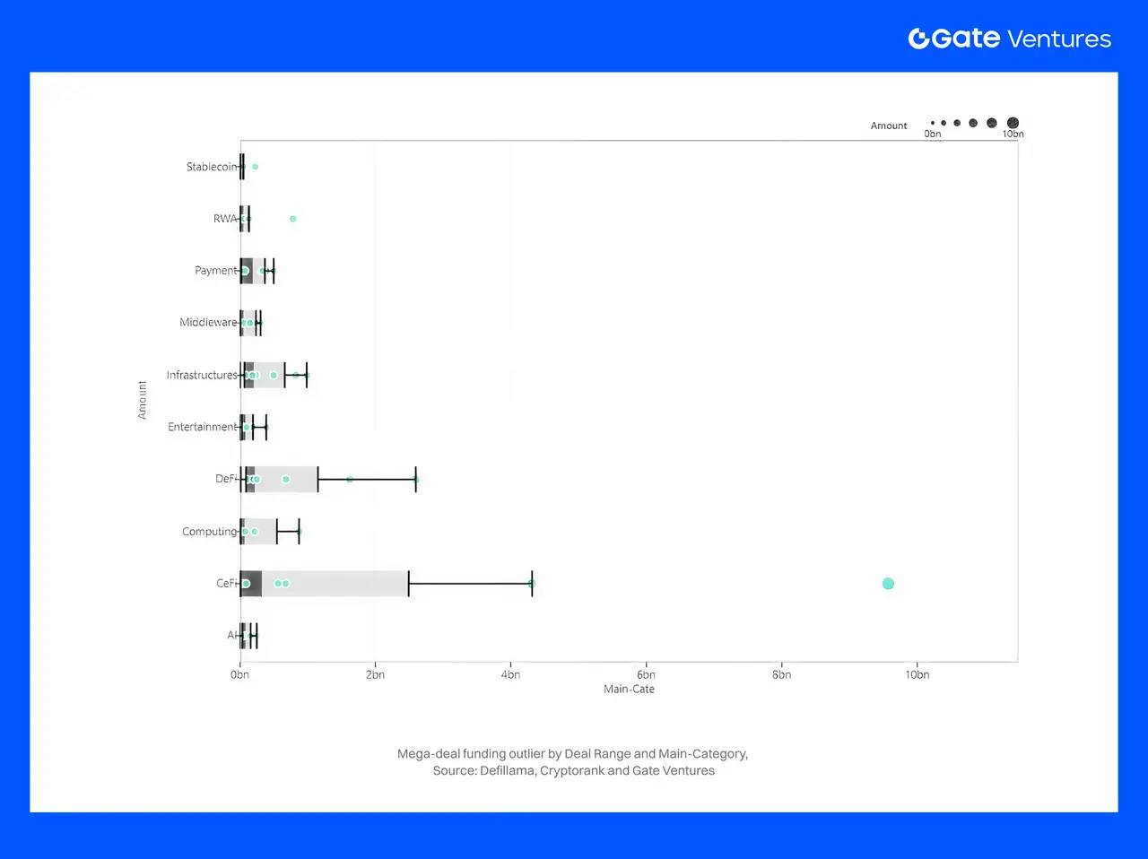 カテゴリーの相関:巨大ラウンドはCeFiとインフラに集中し、取引所・ブローカー・コアブロックチェーンシステムは頻繁に$100M超を調達。一方、エンタメやゲーム/NFTは低額帯にとどまり、通常$5M未満。