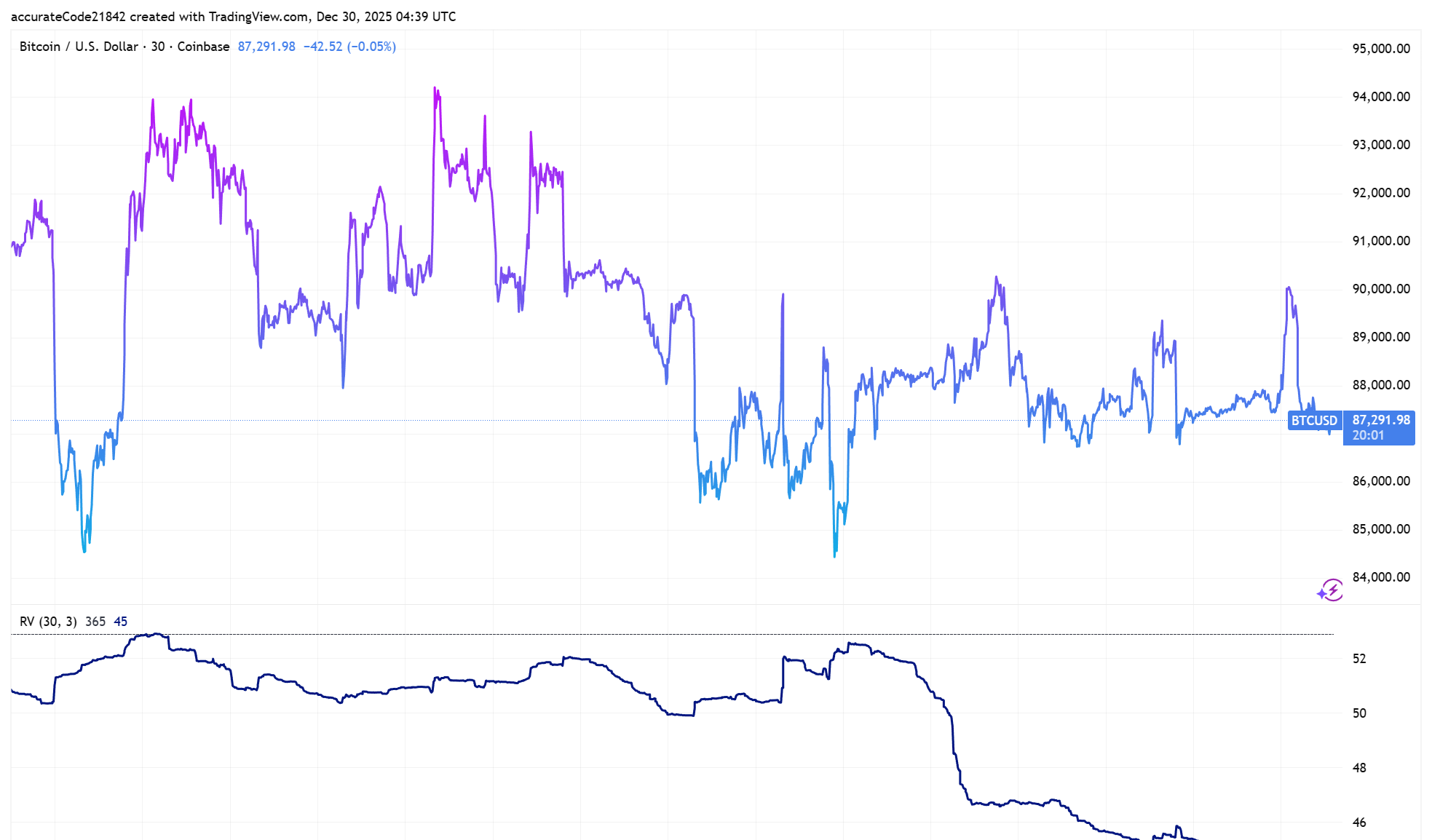 出典:CryptoNewsNetオリジナルタイトル:銀がビットコインを上回る、年末取引の縮小とともにボラティリティが高まるオリジナルリンク:ビットコインと銀は、年末に向けて市場に異なるシグナルを送っており、ボラティリティデータは、トレーダーが一方の資産の価格を積極的に再評価している一方で、もう一方はニュートラルのまま停滞していることを示しています。過去1ヶ月で、ビットコインの30日間の年率換算実現ボラティリティは着実に中間値の40代に縮小しており、市場は依然としてレンジ内で推移し、確信に欠けていることを反映しています。TradingViewのデータによると、45%の30日間実現ボラティリティは、365日平均の48%を大きく下回っています。これはブルーチップ株と比較すると大きく見えるかもしれませんが、半貴金属である工業用金属の銀と比べると何でもありません。銀の実現ボラティリティは、急騰、物理的プレミアムの拡大、世界的な金属市場のストレスにより、50代中盤に急上昇しています。実現または歴史的ボラティリティは、特定期間における資産の実際の価格変動を表します。