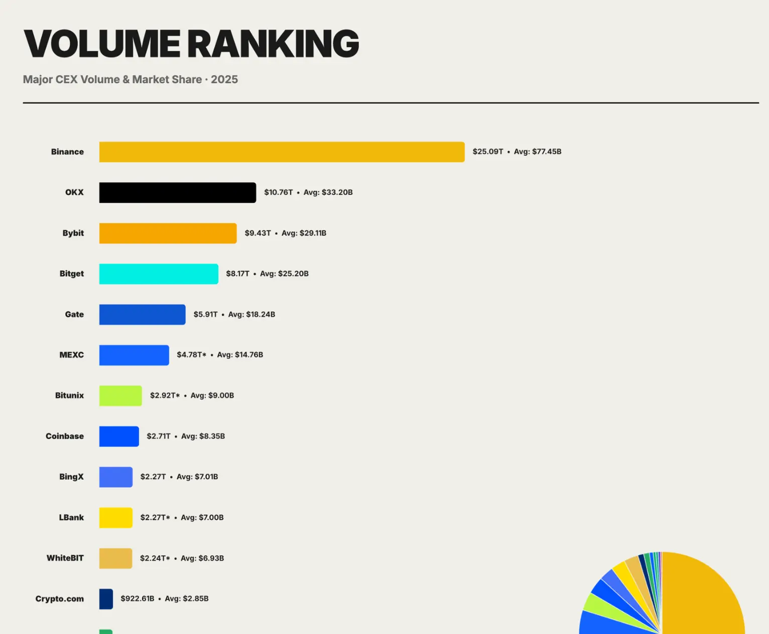Several other major exchanges followed, each posting $8.2 trillion to $10.8 trillion in yearly volume. These four exchanges accounted for about 62.3% of total market share.