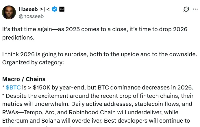 Source: CryptoNewsNet Original Title: Tech giant to launch crypto wallet, fintech L1s will bomb: Dragonfly exec. Original Link: A Big Tech company will integrate a crypto wallet in 2026, and more Fortune 100 companies will start their own blockchains, according to predictions from crypto VC firm Dragonfly’s managing partner Haseeb Qureshi.