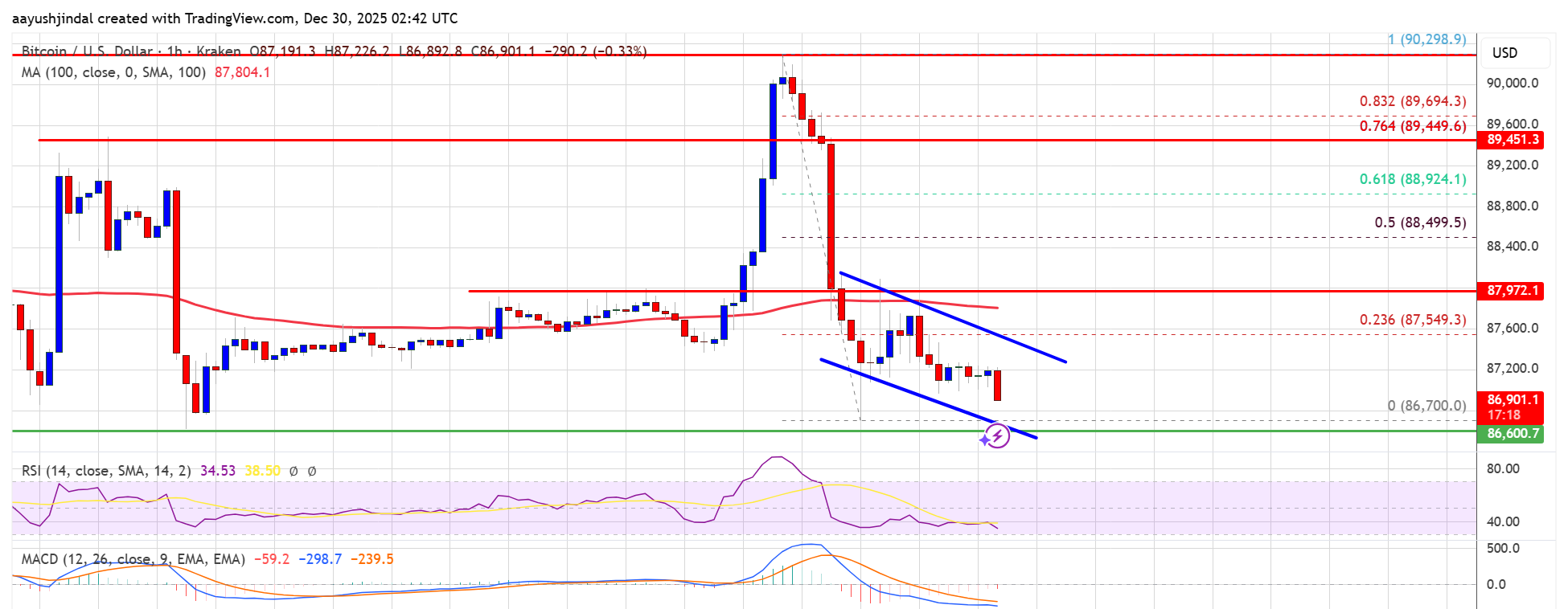 ビットコインは現在、$88,000および100時間単純移動平均線を下回って取引されている。価格が$86,500以上で安定している場合、新たな回復の試みがあるかもしれない。即時の抵抗は$87,500付近にある。BTC/USDペアの1時間チャートには、抵抗線が$87,500で形成される下降チャネルが見られる。