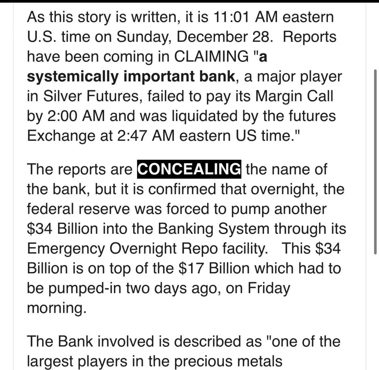 The silver crash coincided with renewed signs of stress in funding markets. Overnight, the Federal Reserve injected $34 billion into the banking system via its emergency overnight repo facility, on top of roughly $17 billion added just two days earlier.