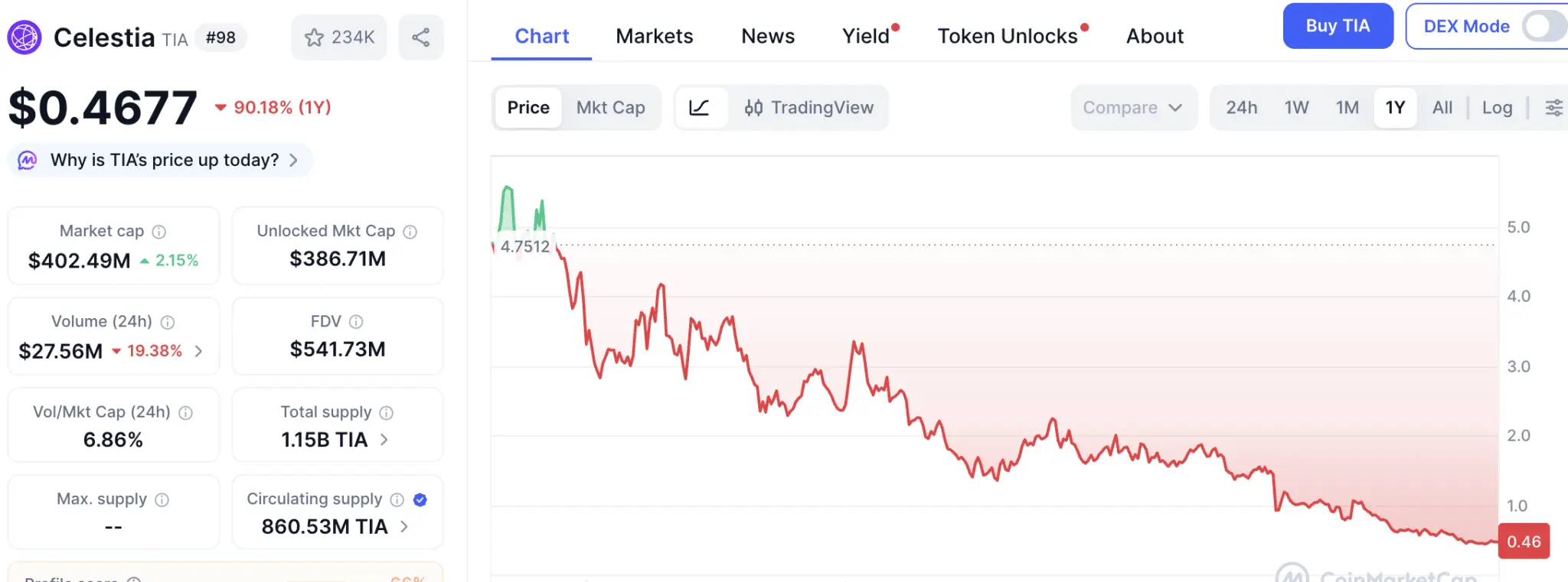 Mostly, the drop was due to unlock and overhang dynamics. Celestia’s vesting and 2024-26 unlock cadence kept selling pressure steady in 2025. By summer, TIA was mainly viewed as a textbook post-airdrop unwind, with continuing emissions tied to thin liquidity.