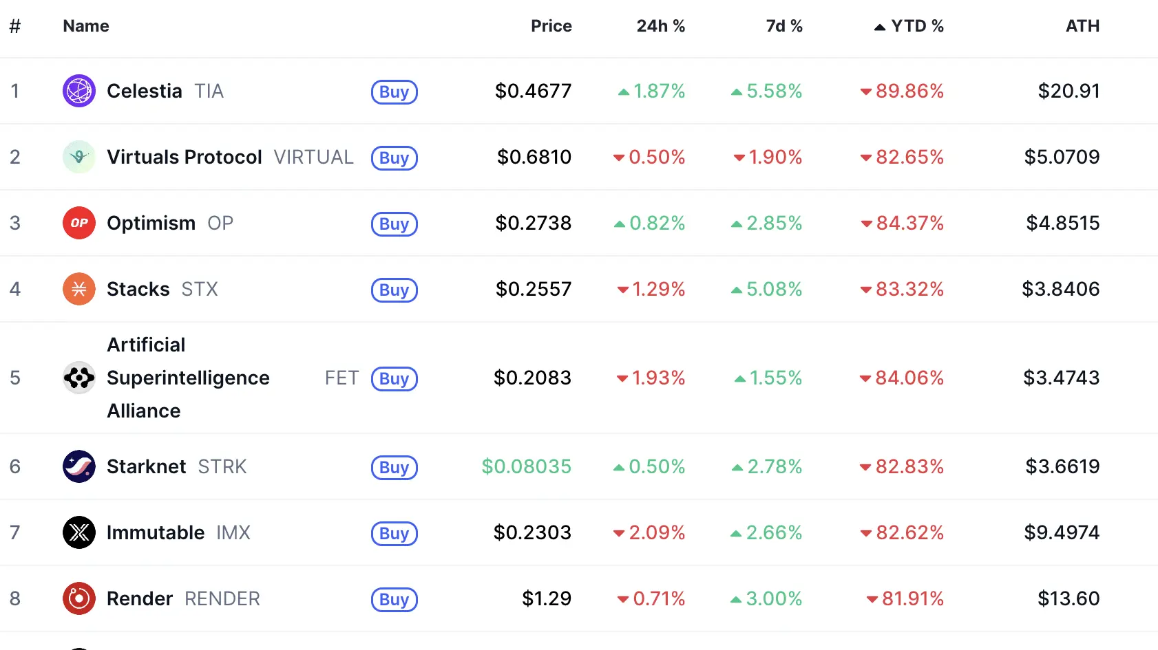 TIA ($0.46, 24h volatility: 0.1%, Market cap: $396.47M, Vol. 24h: $31.27M), a proof-of-stake L1 blockchain optimized for app creation, lost almost 90% year-to-date. According to market data, it fell from about $5.5 at the start of 2025 to $0.46 near year-end.