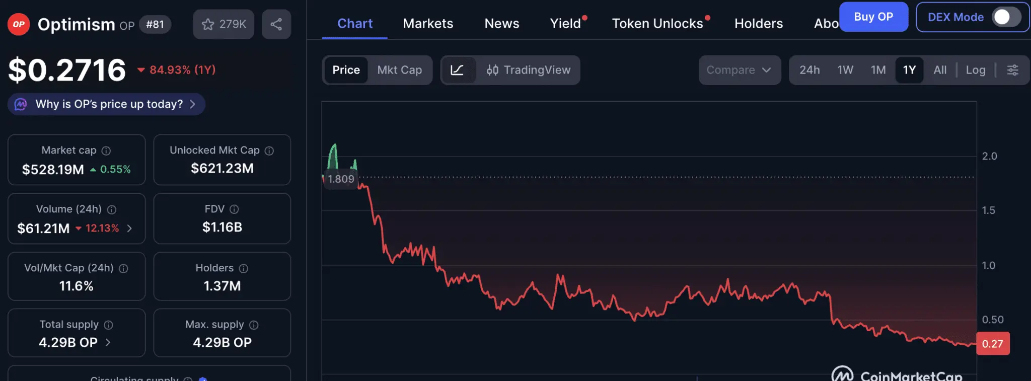 L2 competition was a significant headwind, too. Even as Optimism shipped fault-proofs and progressed on the Stage 1 decentralization path in 2024 and 2025, trading still reflected L2 sector fatigue and rotating liquidity. By September, media coverage framed OP as one of the L2 laggards, with the slide deepening into Q4.