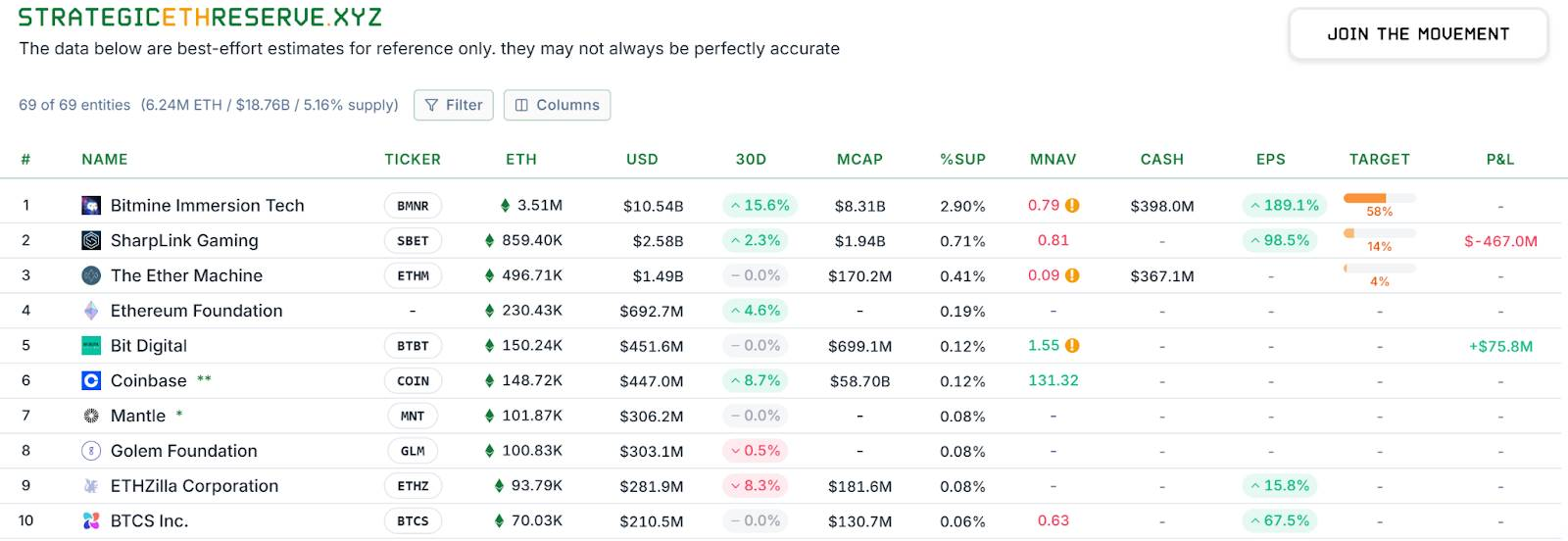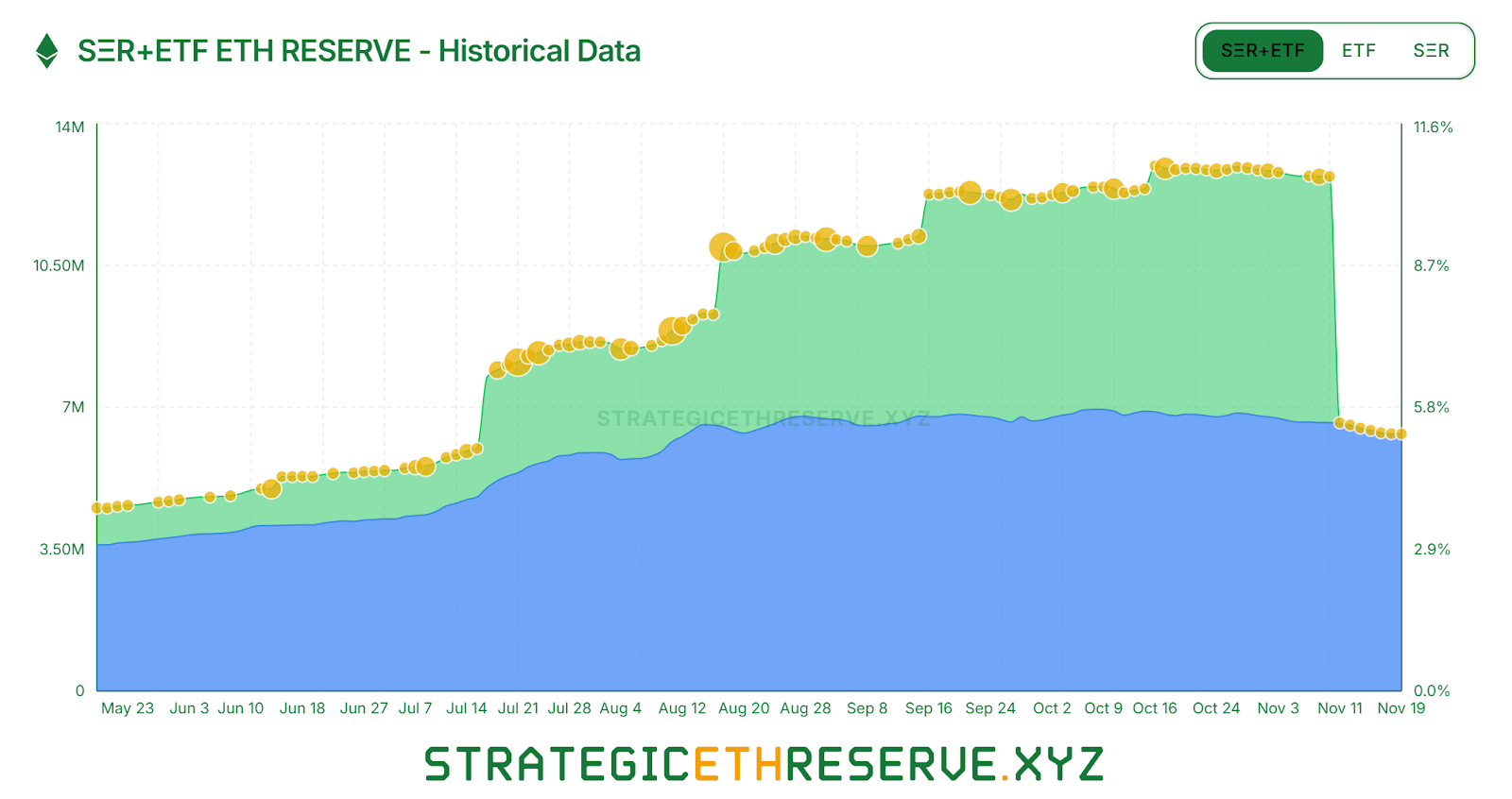 3. Diminuição incremental da empresa DAT: Também se verifica divergência interna no setor. Em meados de novembro, as reservas estratégicas totais de ETH da DAT rondavam os 6,24 milhões de ETH, equivalentes a 5,15% da oferta, com acumulação visivelmente mais lenta. Entre os principais detentores, BitMine mantém-se como o único ainda a comprar ETH de forma agressiva, adicionando mais 67 000 ETH na última semana. SharpLink, outra empresa líder, deixou de comprar desde meados de outubro após adquirir 19 300 ETH a um custo médio de 3 609 $, estando agora com perdas não realizadas. Algumas tesourarias de menor dimensão foram obrigadas a vender ativos para sobreviver, como a “ETHZilla”, que vendeu cerca de 40 000 ETH no final de outubro para recomprar ações e reduzir o desconto. O setor das tesourarias passou de expansão generalizada para polarização: os grandes players mal conseguem manter as compras, enquanto os mais pequenos enfrentam restrições de liquidez e pressão da dívida, sendo forçados a reduzir posições e cortar perdas.