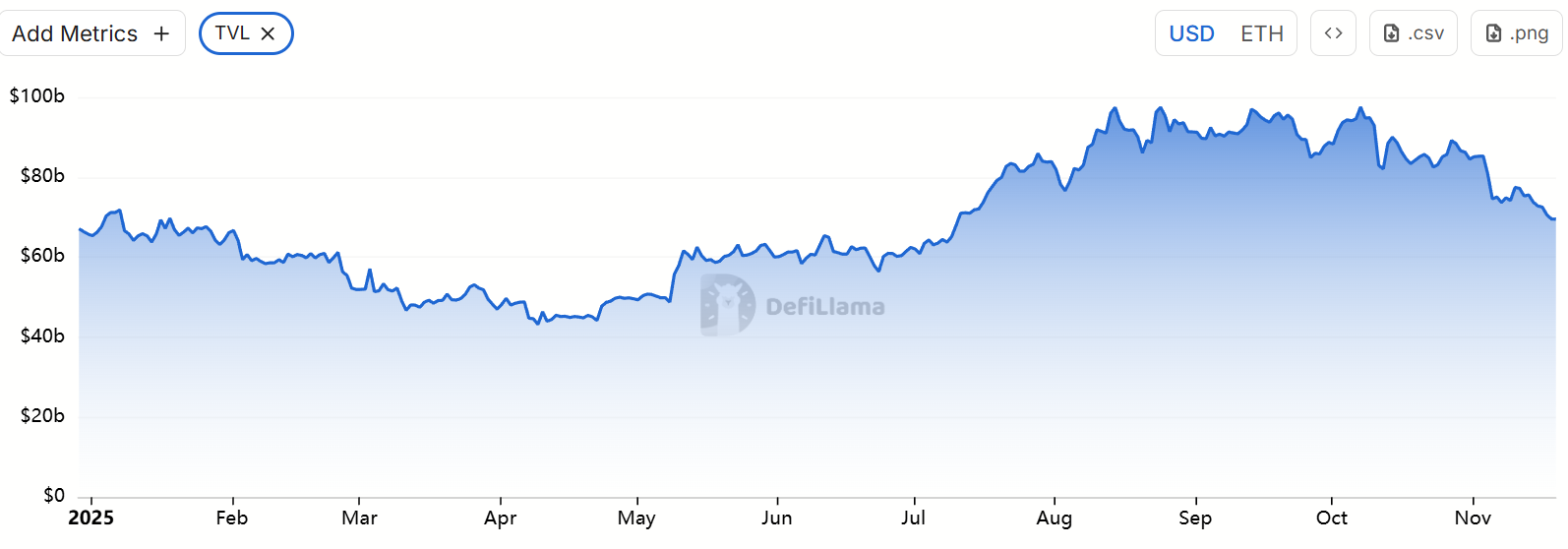 Contudo, a incerteza macroeconómica tem condicionado Ethereum desde o início de outubro, levando o preço de um máximo de 4 900 $ para uma tendência descendente. O súbito evento cisne negro “crash 10·11” deixou o ETH fragilizado, oscilando recentemente em torno dos 3 000 $—uma queda superior a 30% face ao topo. O capital que anteriormente sustentava a valorização do ETH está a retrair-se: as ações da DAT Treasury Company afundaram, as posições passaram de lucro para prejuízo e alguns acionistas estão a desinvestir. Vários ETF spot globais de ETH continuam a registar saídas líquidas, enquanto investidores institucionais tradicionais optam por aguardar. Em simultâneo, o ecossistema Ethereum arrefece: o valor total bloqueado (TVL) caiu mais de 20% desde outubro, as stablecoins on-chain perderam o peg repetidamente e os protocolos DeFi enfrentaram sucessivas dificuldades.