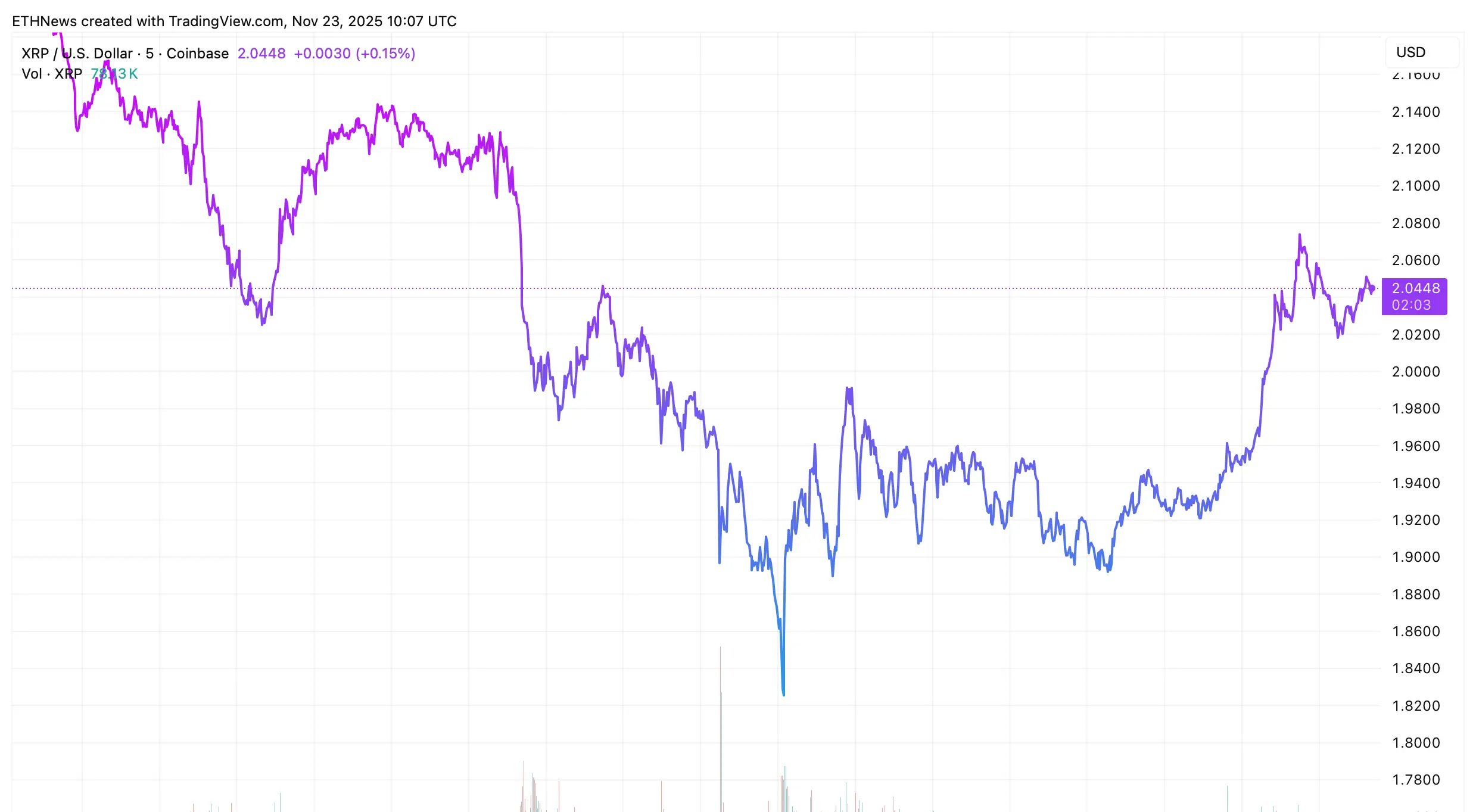 Os dados de mercado recém-atualizados confirmam o mesmo tom de baixa: o sentimento permanece de medo extremo, a volatilidade está elevada e o XRP é negociado perto de mínimas de vários meses em torno de $2.05.
