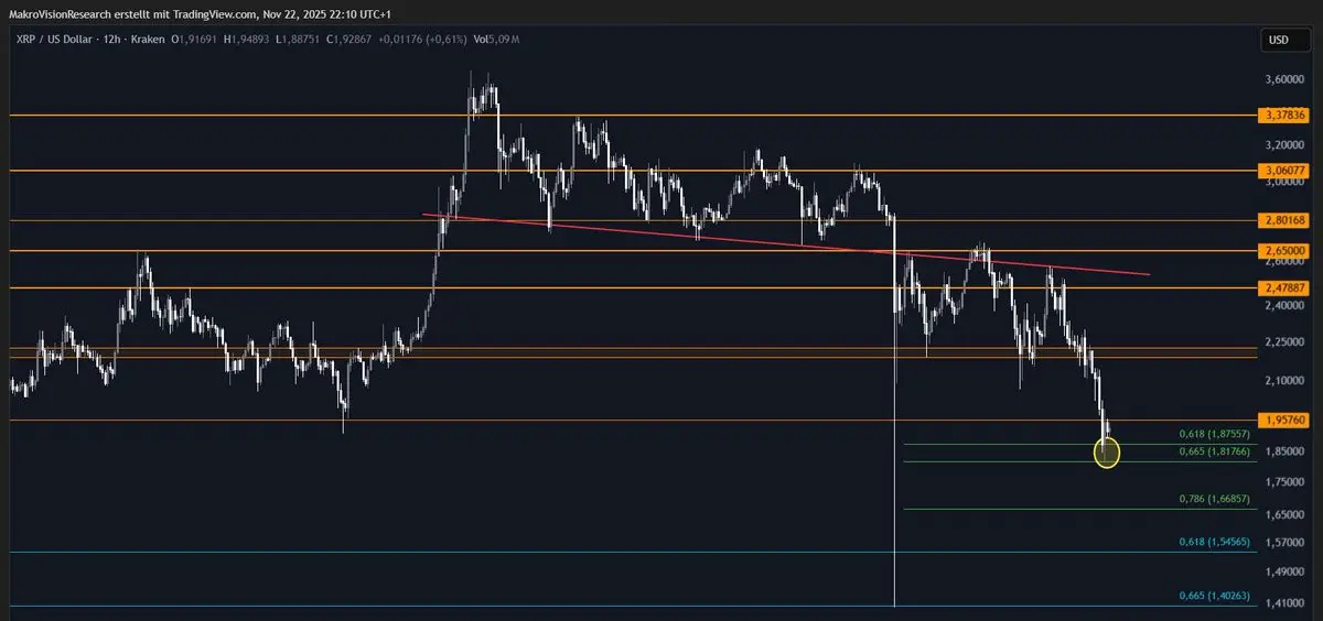 O gráfico mais recente da MakroVision mostra o XRP a cair precisamente no Golden Pocket entre 0.618–0.665, entre $1.87–$1.82, uma zona historicamente importante onde os ativos costumam tentar estabilizar. Esta área foi destacada no gráfico com um marcador amarelo, e o XRP tocou-a perfeitamente.