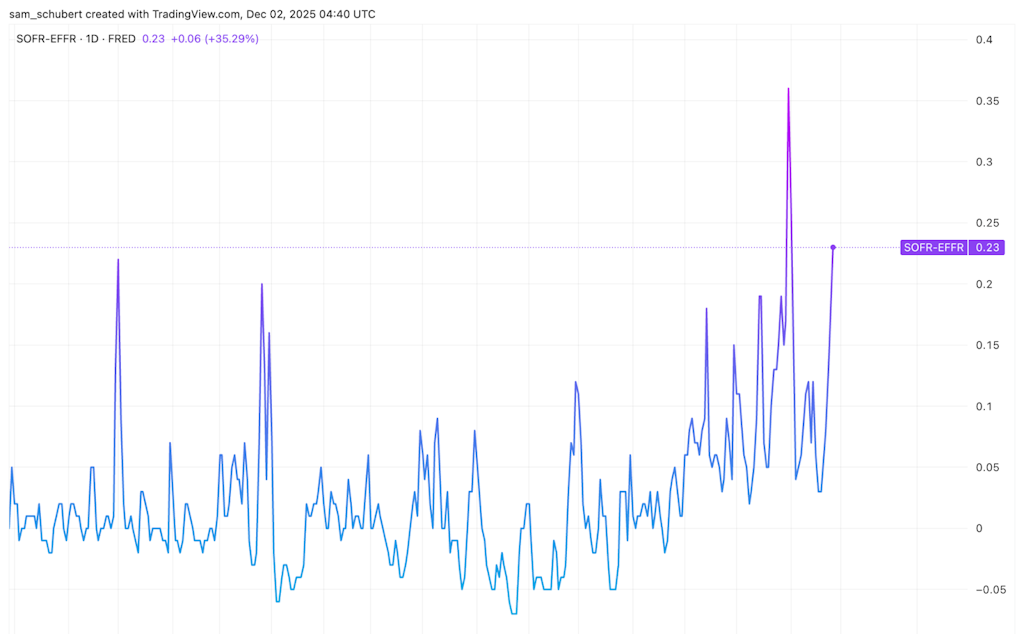 Os mercados permanecem hiperfocados nas desenvolvimentos das taxas dos Estados Unidos. A ferramenta CME FedWatch agora atribui uma probabilidade de 87% de um corte de 25bps em dezembro, e vemos o recente movimento no SOFR, materialmente acima do limite superior do Fed, como um sinal claro de estresse emergente de liquidez e reservas bancárias. Quando a taxa garantida overnight chave é persistentemente precificada acima do topo do corredor de política, isso sugere que as reservas estão se tornando escassas na margem e que a capacidade do balanço está limitada. Todos os olhos estão agora na próxima movimentação do Fed, uma vez que um ajuste em qualquer uma das operações do balanço ou do conjunto de taxas administradas será necessário para aliviar essa tensão e reancorar a precificação do mercado monetário de volta dentro da faixa-alvo.