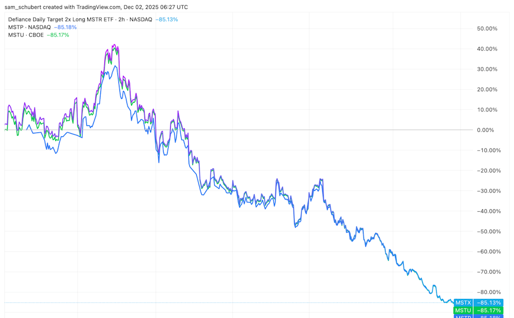 Os ETFs alavancados construídos em torno da negociação Strategy estão a suportar o peso do movimento, com MSTX e MSTU, que visam 2x o retorno diário da Strategy, entre os 10 ETFs dos EUA com pior desempenho este ano, após perdas de mais de 80%. O mais recente MSTP está em queda semelhante desde o lançamento, e o valor do trio encolheu de mais de 2,3 bilhões de dólares no início de outubro para cerca de 0,8 bilhões de dólares hoje. Estes produtos mostram como uma queda de 60% nas ações e uma contração de 30% no BTC podem ser ampliadas pela degradação da volatilidade, onde os ganhos e perdas compostos podem corroer os retornos mesmo que a ação termine estável. Isso deixou os investidores de varejo que entraram tarde com pesadas perdas, transformando a negociação alavancada MSTR, outrora popular, em um caso clássico de reflexividade negativa.