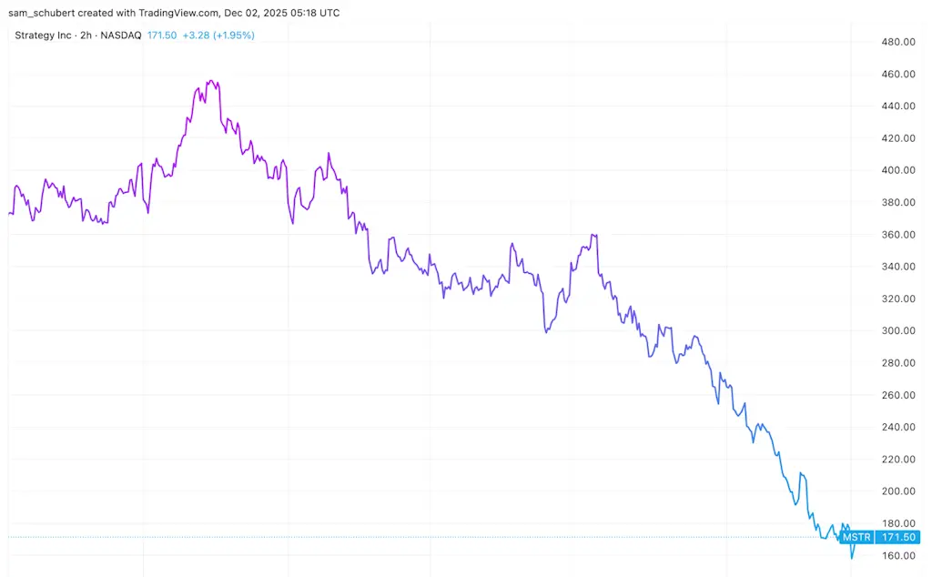 A estratégia de ações foi o foco principal ontem, à medida que se estendeu sua queda. As ações negociaram abaixo de $160 na segunda-feira, antes de fechar perto de $171, deixando a MSTR em queda de aproximadamente 37% no último mês e mais de 60% em relação aos máximos de julho de 2025.