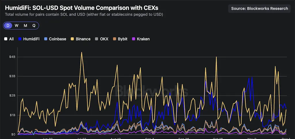 HumidiFi não só domina a quota de mercado de volumes DEX da Solana, como também eclipsa a maioria das CEXs em volumes spot SOL-USD. HumidiFi está a ter uma média de mais de $1 bilhões em volumes diários SOL-USD, ultrapassando recentemente certas bolsas importantes como o principal local. A rápida ascensão da HumidiFi ao topo desde o seu lançamento em Junho mostra o incrível progresso que a equipa principal fez no design do AMM prop.