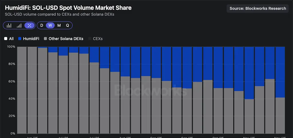 A HumidiFi consolidou-se como o principal AMM prop por volume de negociação nos últimos meses. Representou 51% dos volumes de SOL-stablecoin na cadeia em novembro e 36% do volume total de DEX da Solana, superando todos os outros DEXs, incluindo AMMs tradicionais como Orca e Raydium.