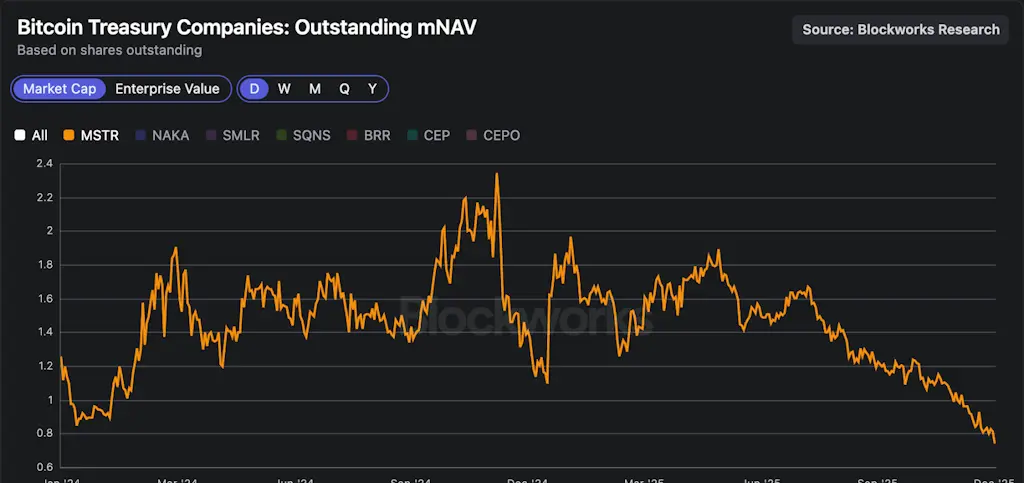 A notável relação mNAV caiu abaixo de 1 no início de novembro e agora está deslizando em direção a 0,75 como uma clara reflexão do atual ambiente de aversão ao risco. Essa dinâmica levanta preocupações sobre potenciais efeitos em cascata, uma vez que esses veículos podem amplificar tanto os rebaixamentos quanto as vendas forçadas se o capital negociar a um desconto persistente em relação aos ativos subjacentes.