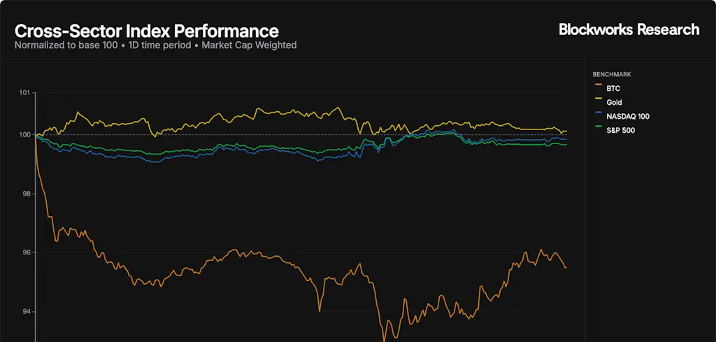 Os mercados ficaram sob pressão na segunda-feira, à medida que as criptomoedas foram vendidas, mesmo enquanto as probabilidades de corte de taxas permaneceram elevadas. O Bitcoin negociou em baixa ao longo da sessão, em um ponto caiu mais de 6% no dia, antes de terminar em baixa de cerca de 4,5%. O Nasdaq 100 (-0,2%) e o S&P 500 (-0,3%) caíram apenas modestamente, enquanto o ouro (+0,1%) mais uma vez superou o BTC e manteve-se próximo dos máximos recentes.