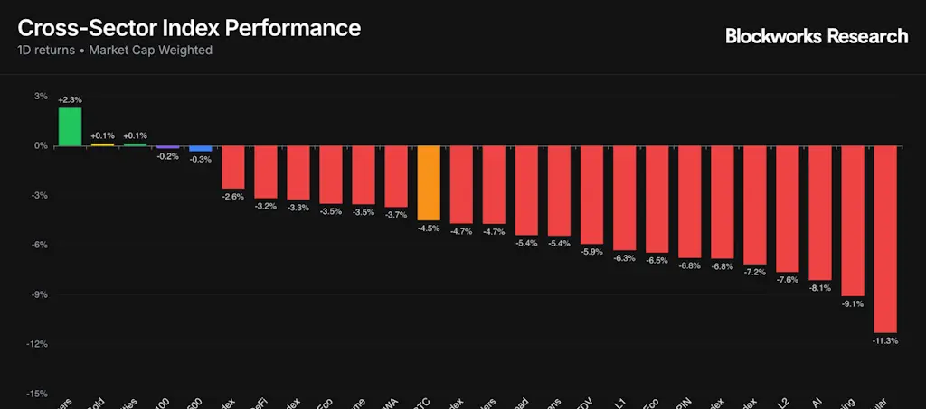 No lado das criptomoedas, o desempenho foi amplamente mais fraco, uma vez que a maioria dos índices setoriais teve um desempenho inferior ao BTC após um mês difícil para os ativos de risco. O grupo com melhor desempenho foi o dos Mineiros de Cripto (+2,3%), que continuou a se desvincular do resto do complexo, enquanto as Ações de Cripto (+0,1%) foram marginalmente positivas. No outro extremo do espectro, Modular caiu 11,3%, Gaming diminuiu 9,1% e o cesto de IA caiu 8,1%. Entretanto, os índices L2, DEX e DePIN também caíram entre 6% a 8% no dia. Esse padrão é consistente com a redução de risco contínua em tokens de maior risco, enquanto os mercados aguardam uma confirmação mais clara de que o Fed agirá para aliviar as atuais preocupações com o estresse de liquidez.